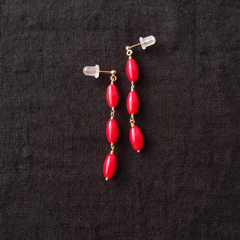 ナチュラルなレッドコーラルを使ったライスシェイプのロングピアス。