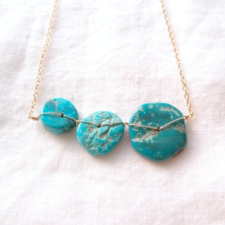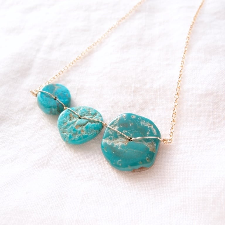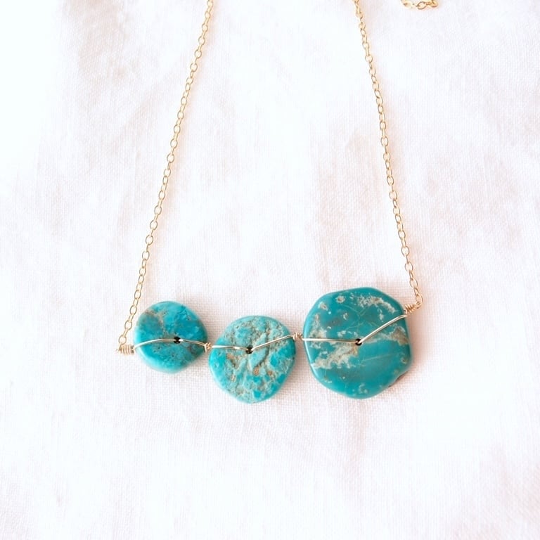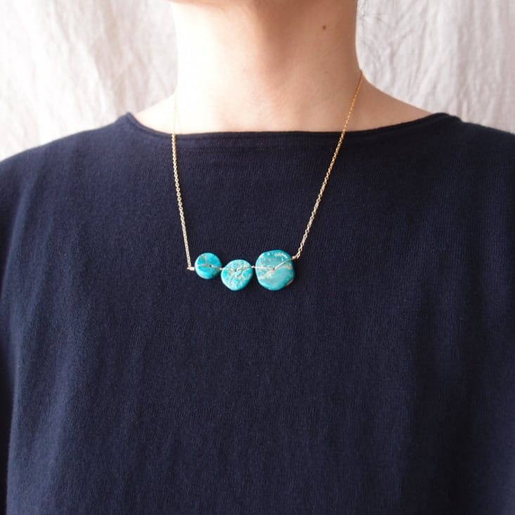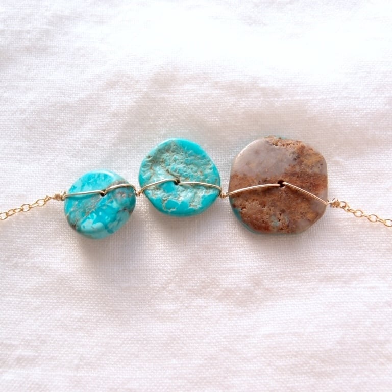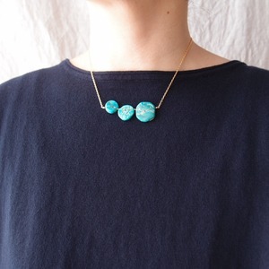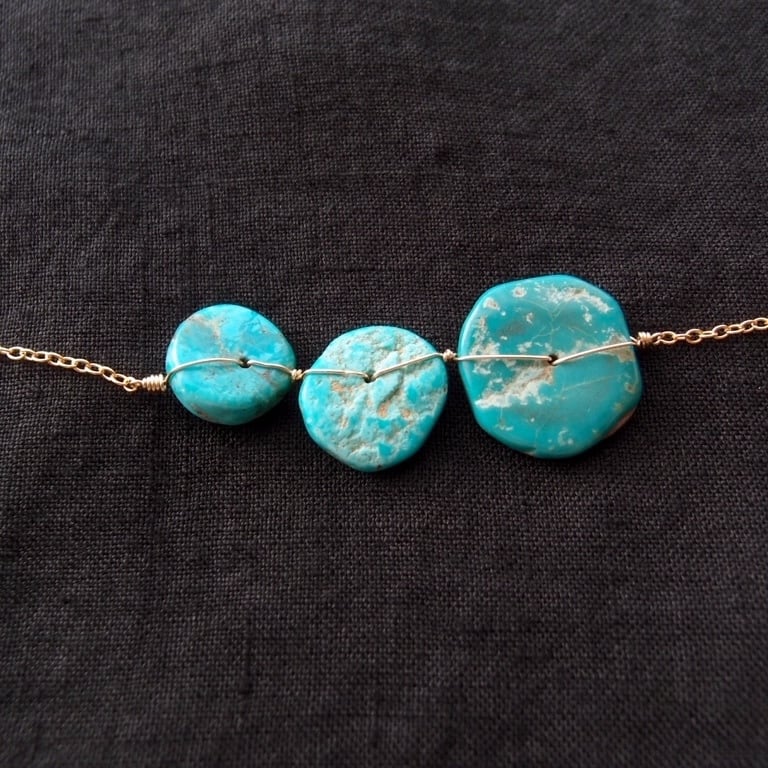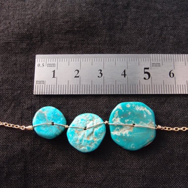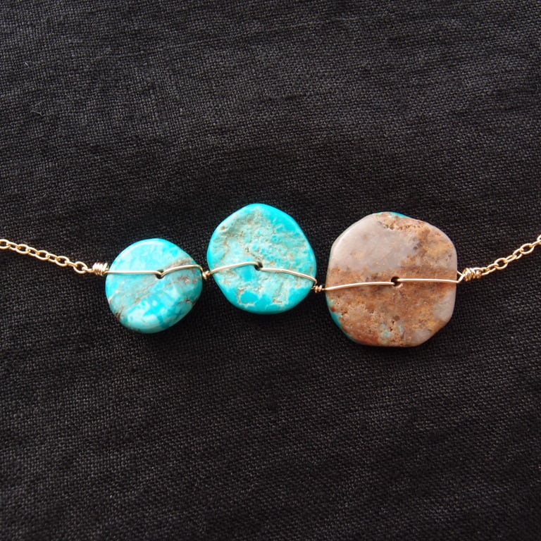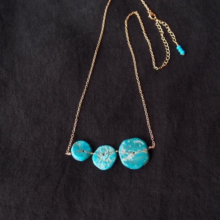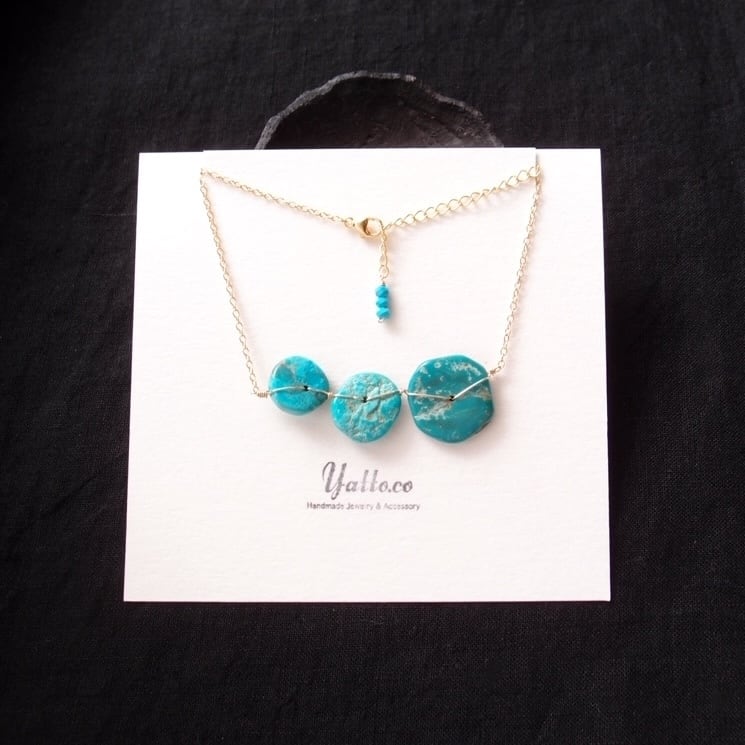 1枚1枚表情が異なる天然ターコイズをK14gf(14金ゴールドフィルド)のワイヤーで丁寧に、かつ丈夫に固定しました。