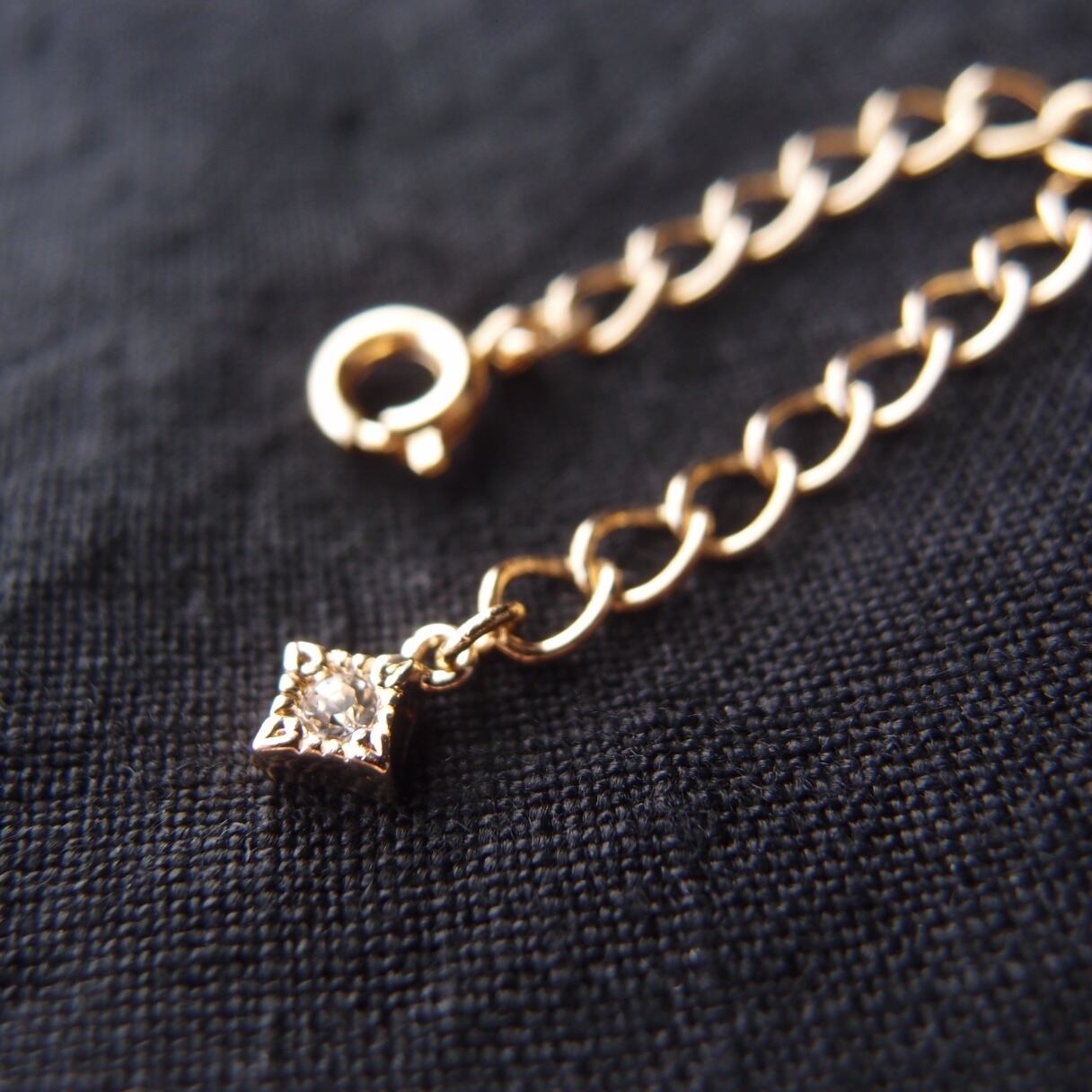 ミル打ち加工の小さなダイヤ型チャームが輝きます。