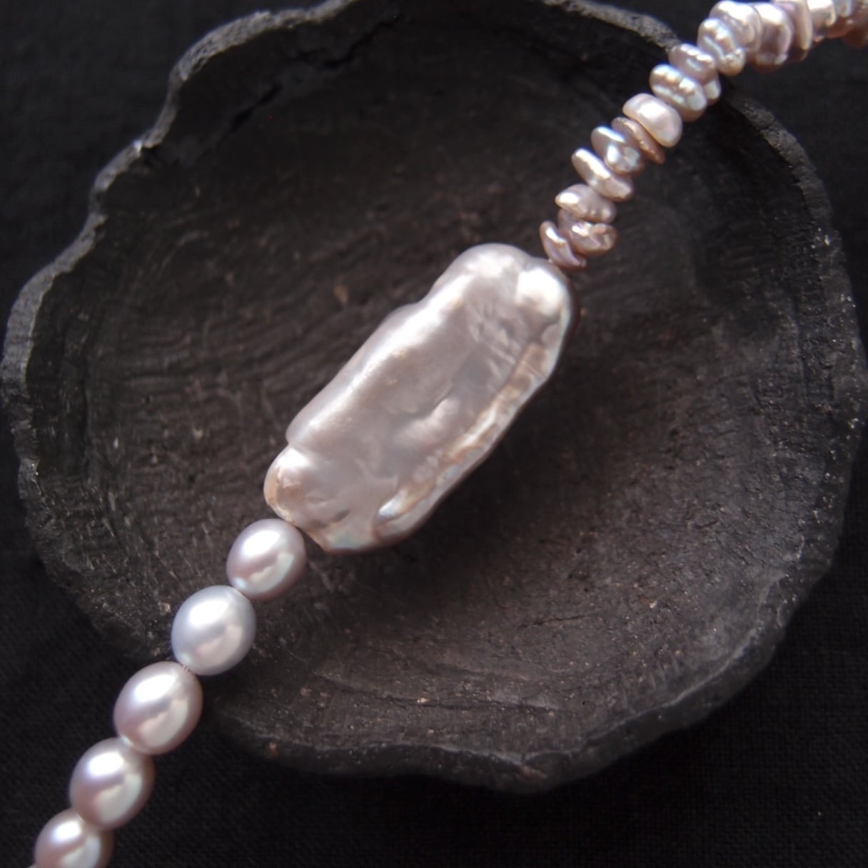 ビワとケシ、2種類の個性的なパールを上質な6mmライスパールが落ち着いた印象に統一してくれるネックレスです。