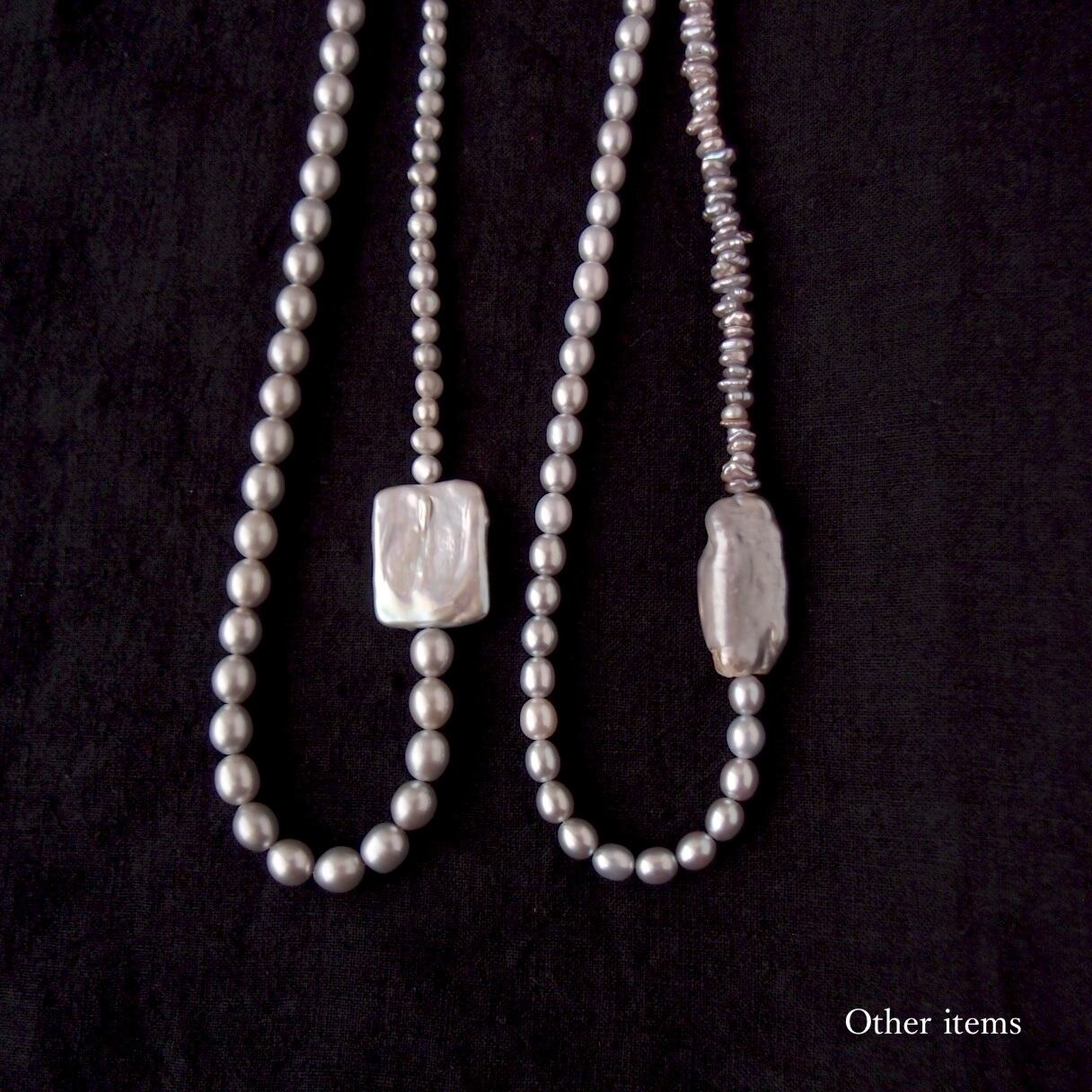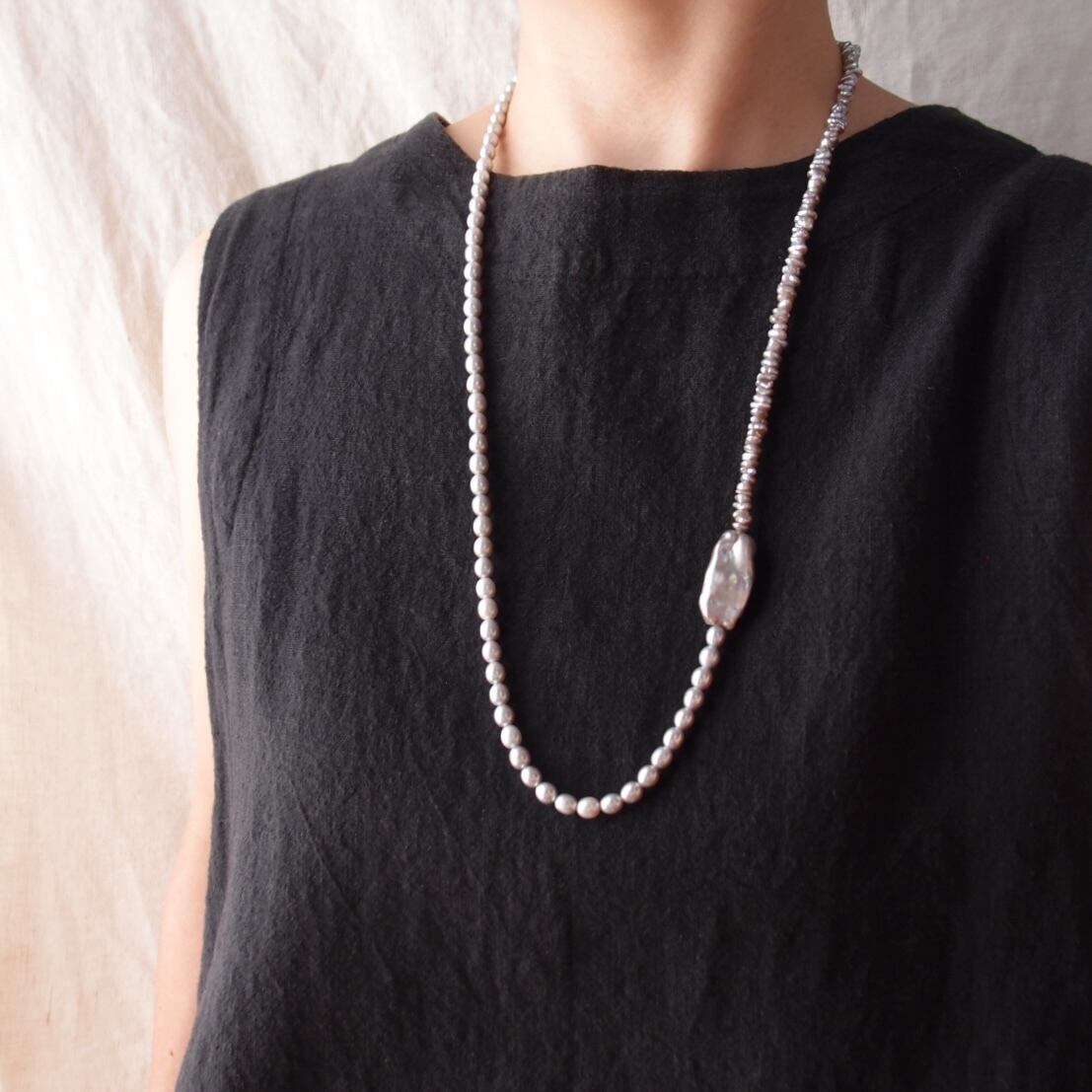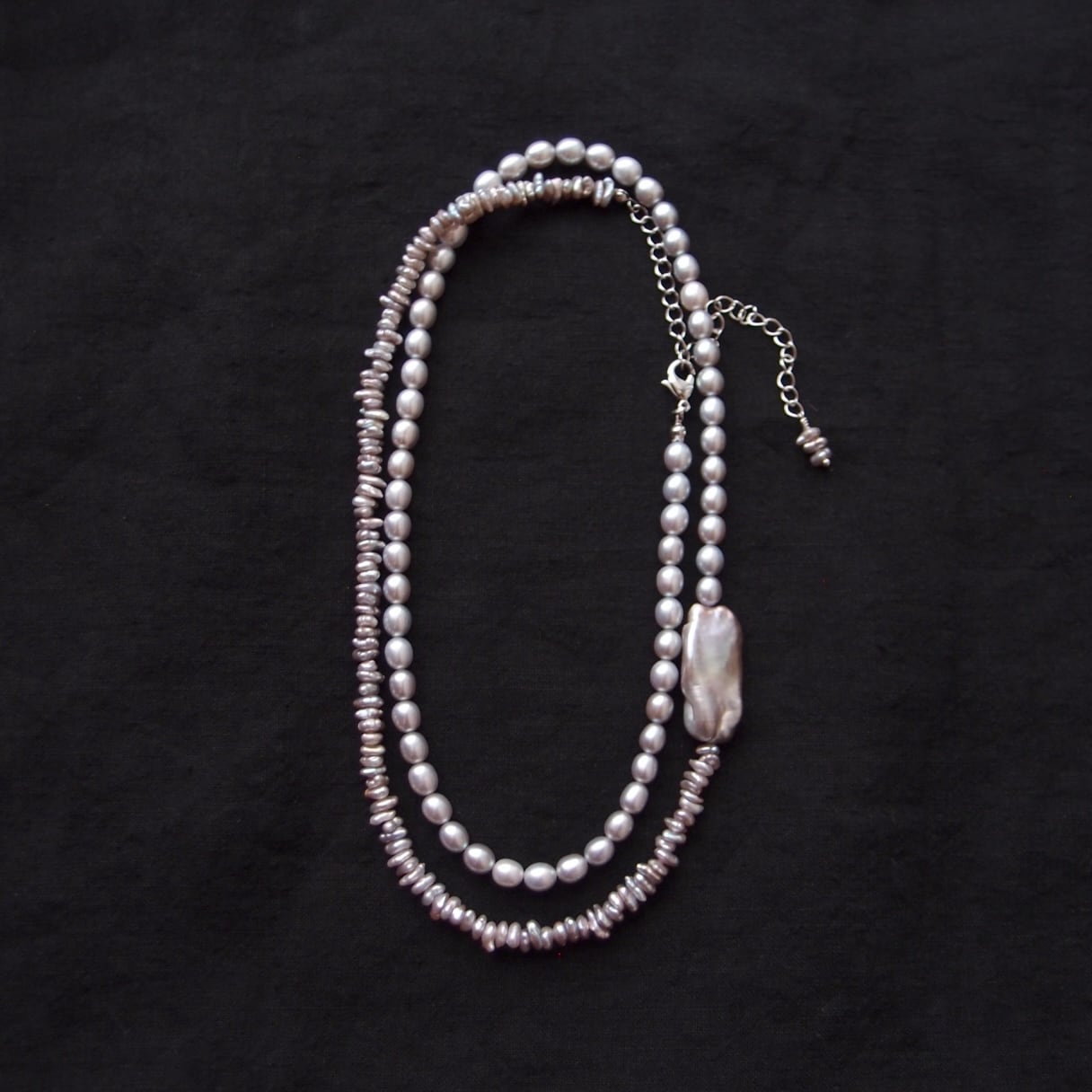 色味の異なる3種類のグレーパールをワントーンにまとめた非対称ネックレス。