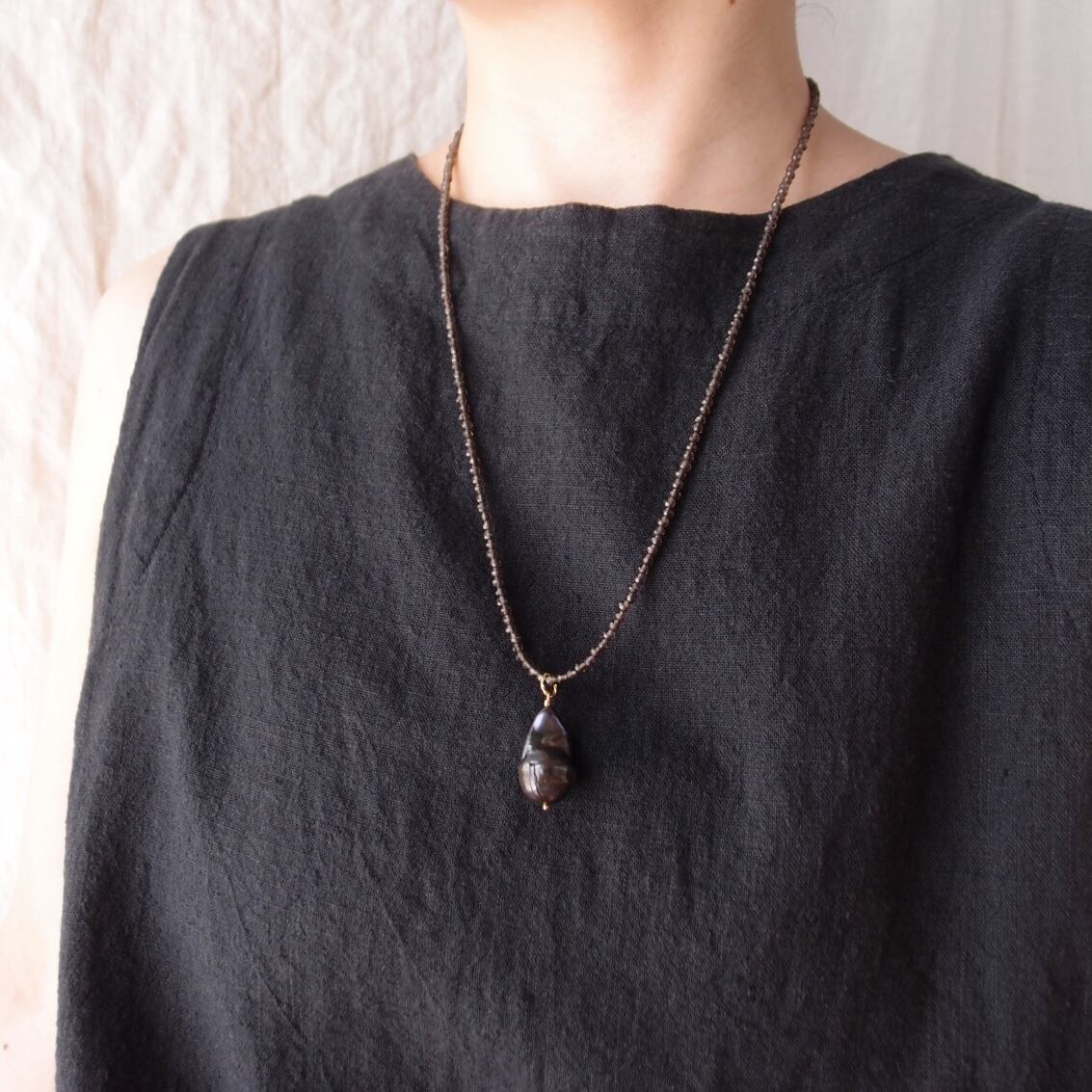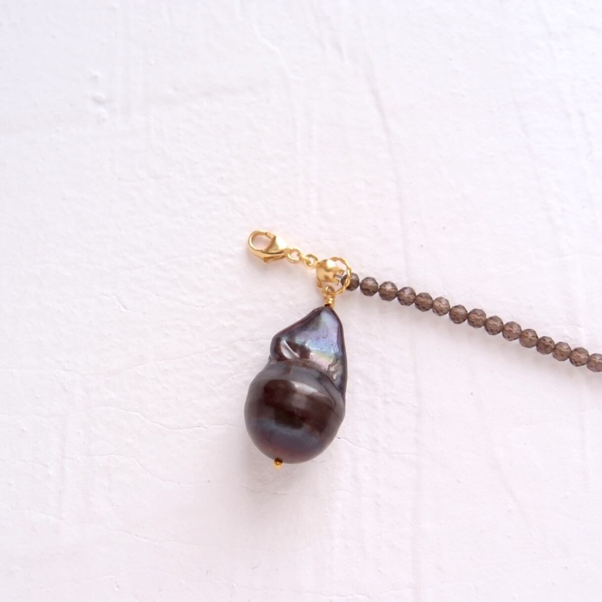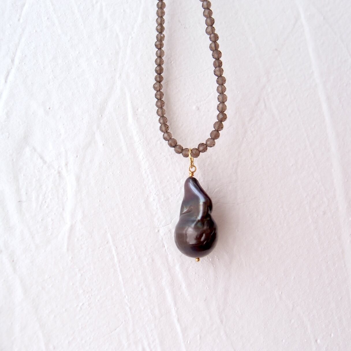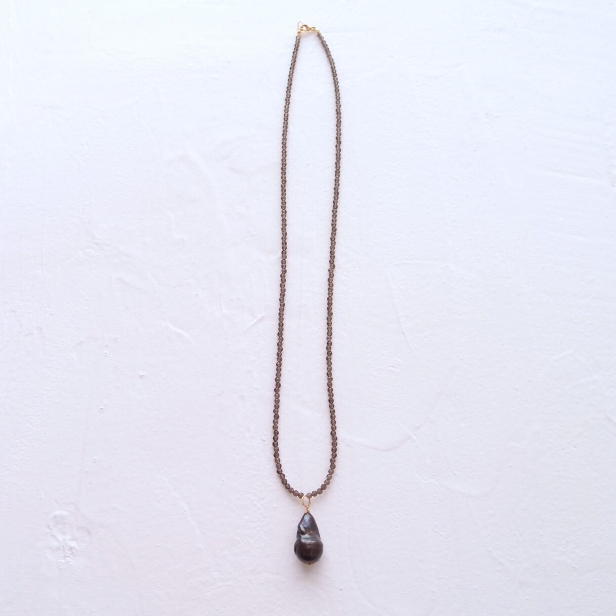 【K14gf】Colored Stone Plane Necklace+Charm Set/プレーンネックレス+チャームセット(Baroque Pearl × Smoky Quartz)