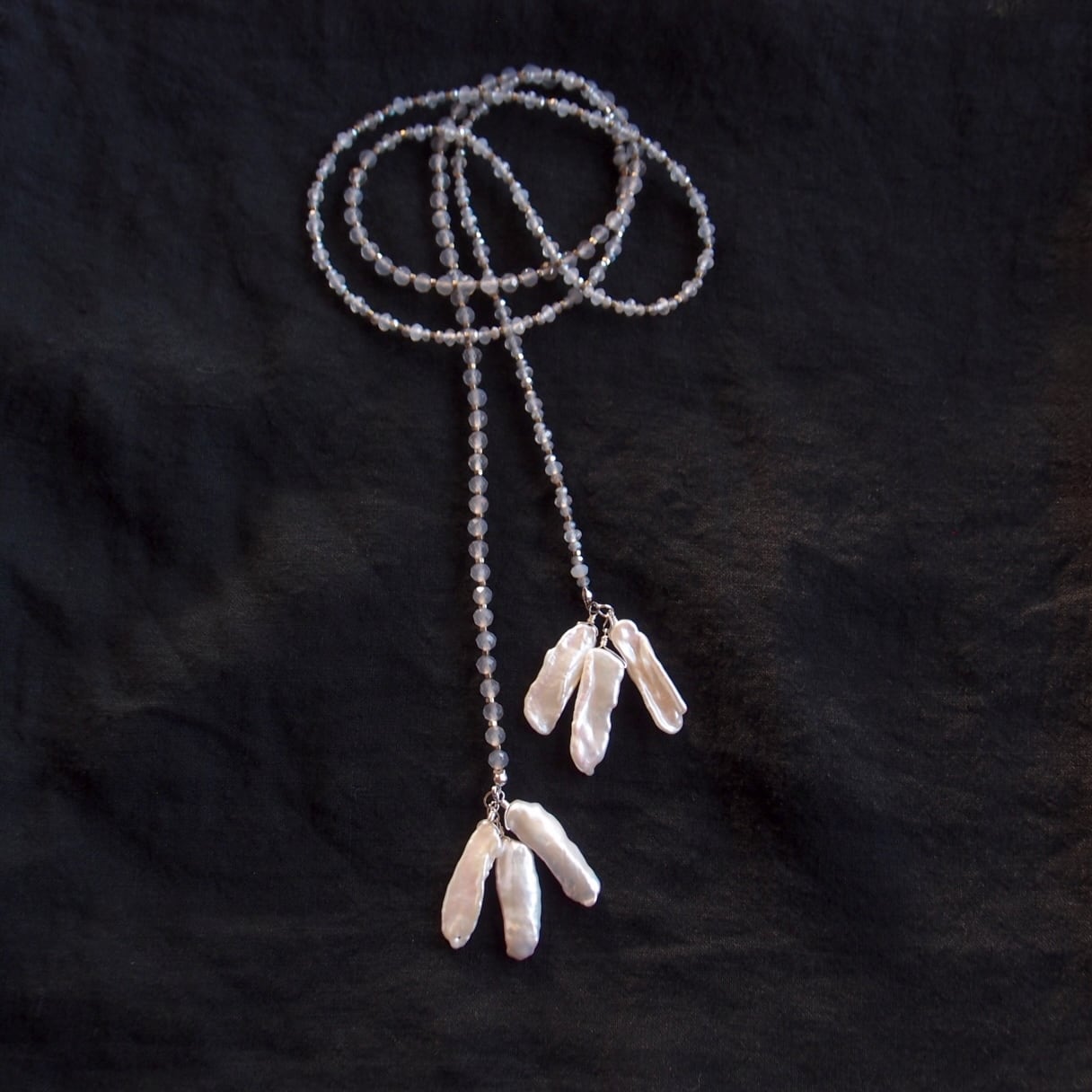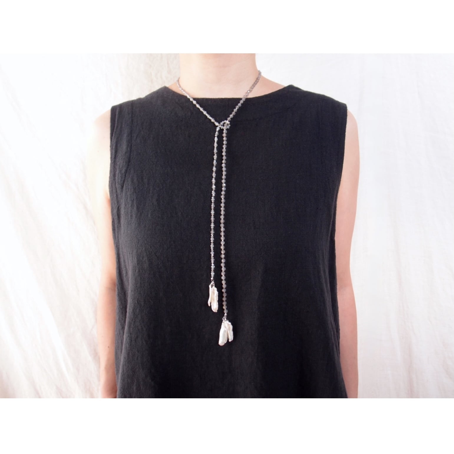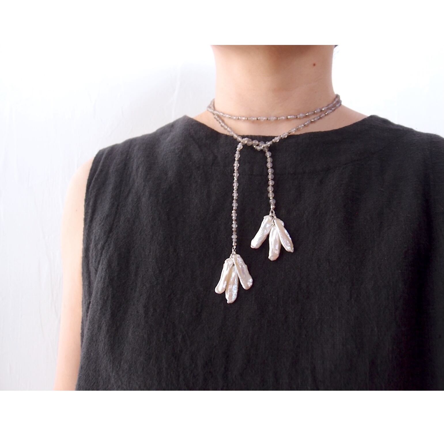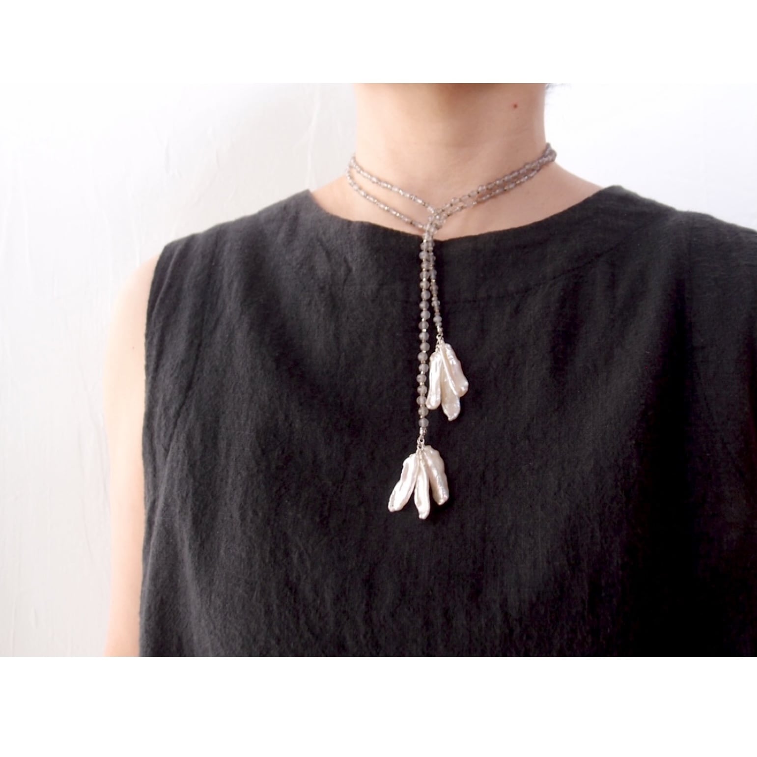 Feather Pearl × Gray onyx Lariat Necklace/フェザーパール×グレーオニキス ラリエットネックレス