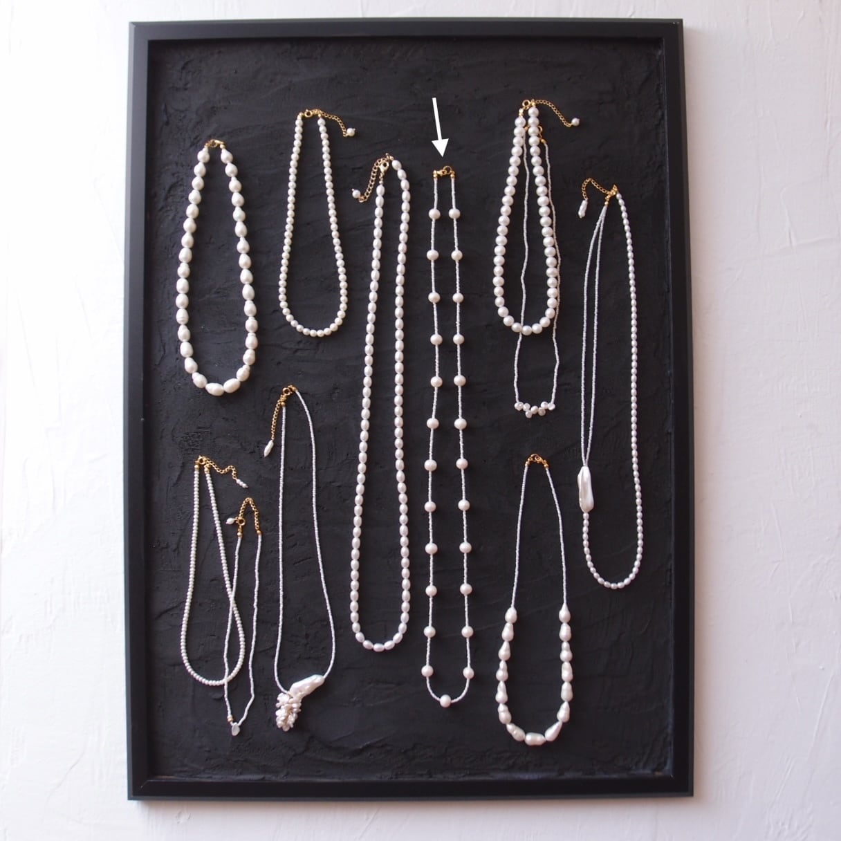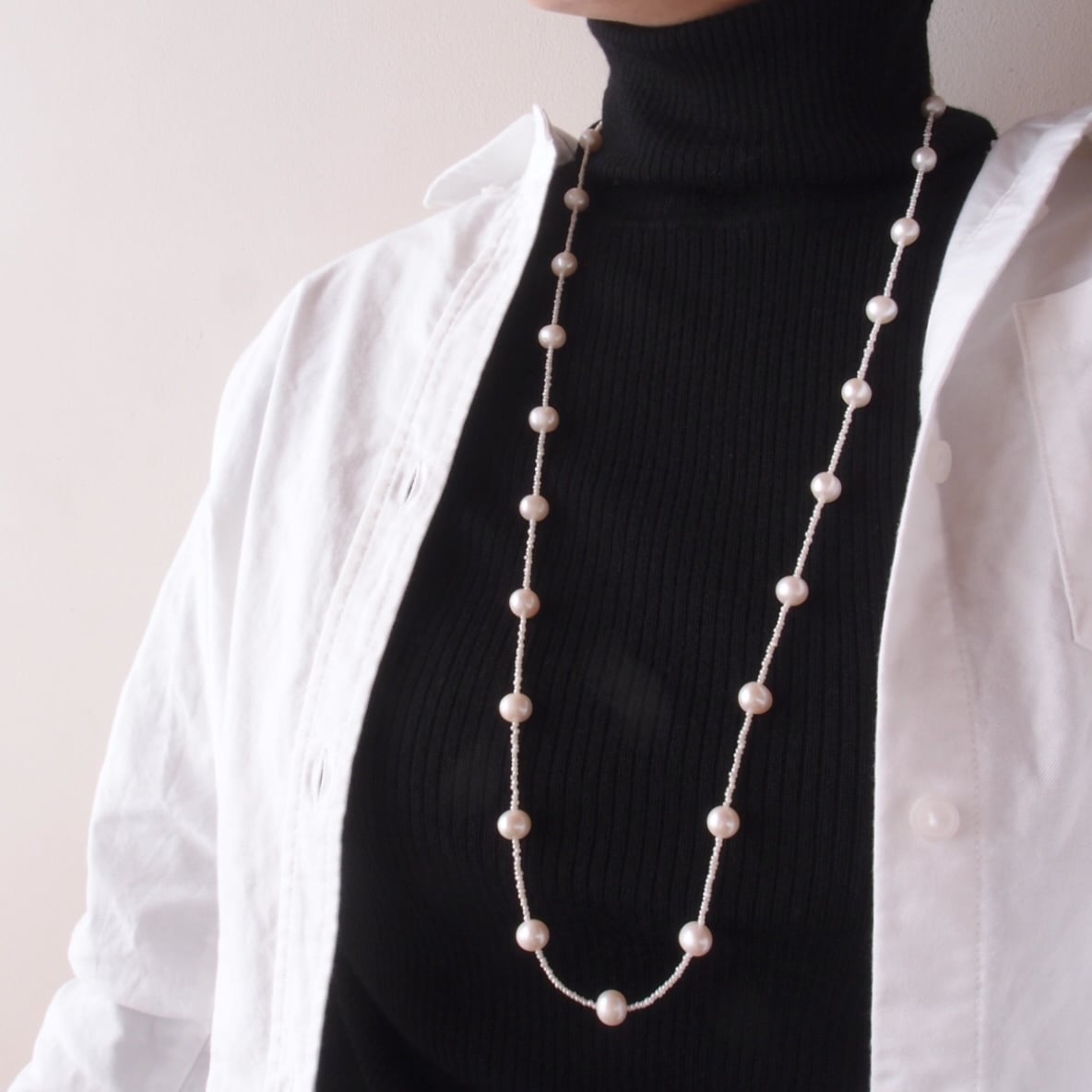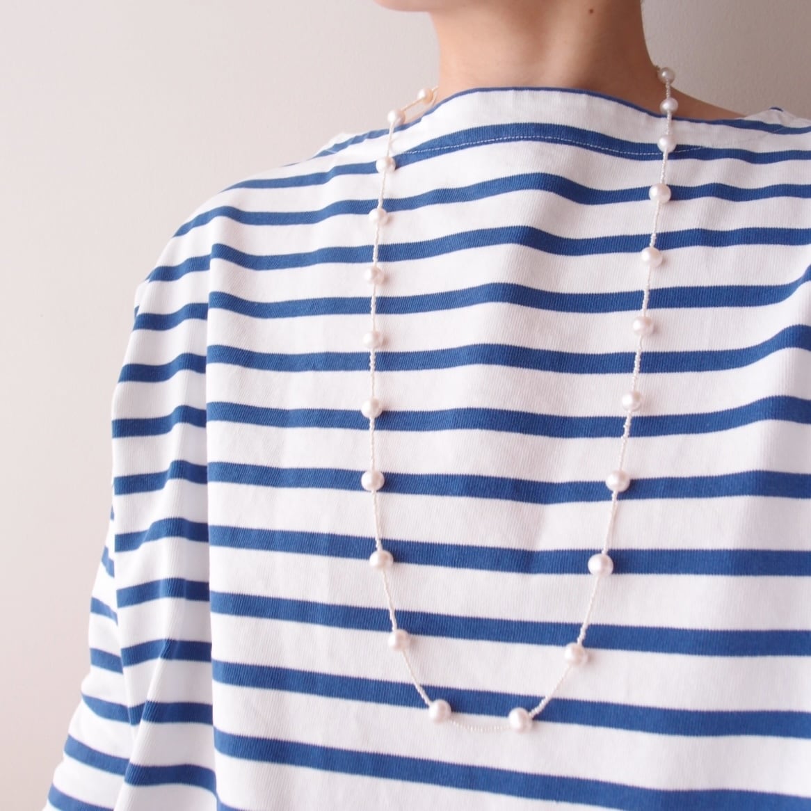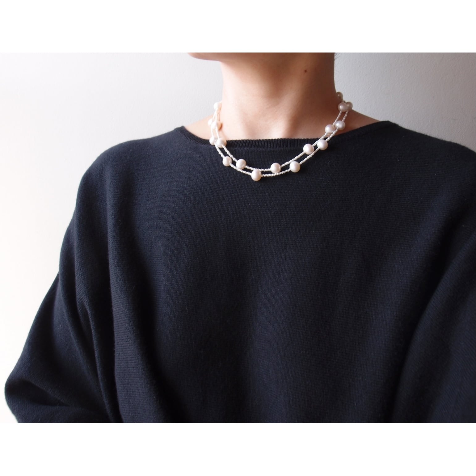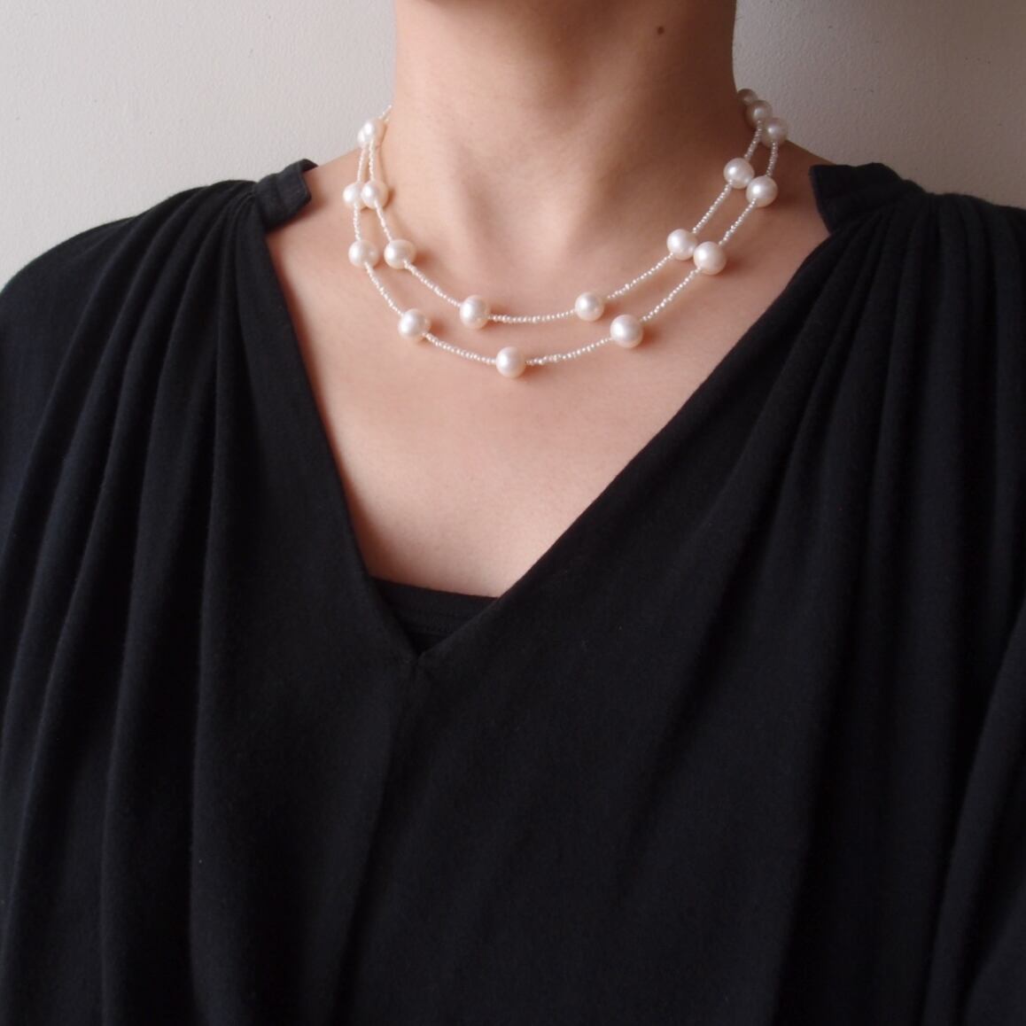 照りの良い大粒パールを散りばめたステーションネックレス。