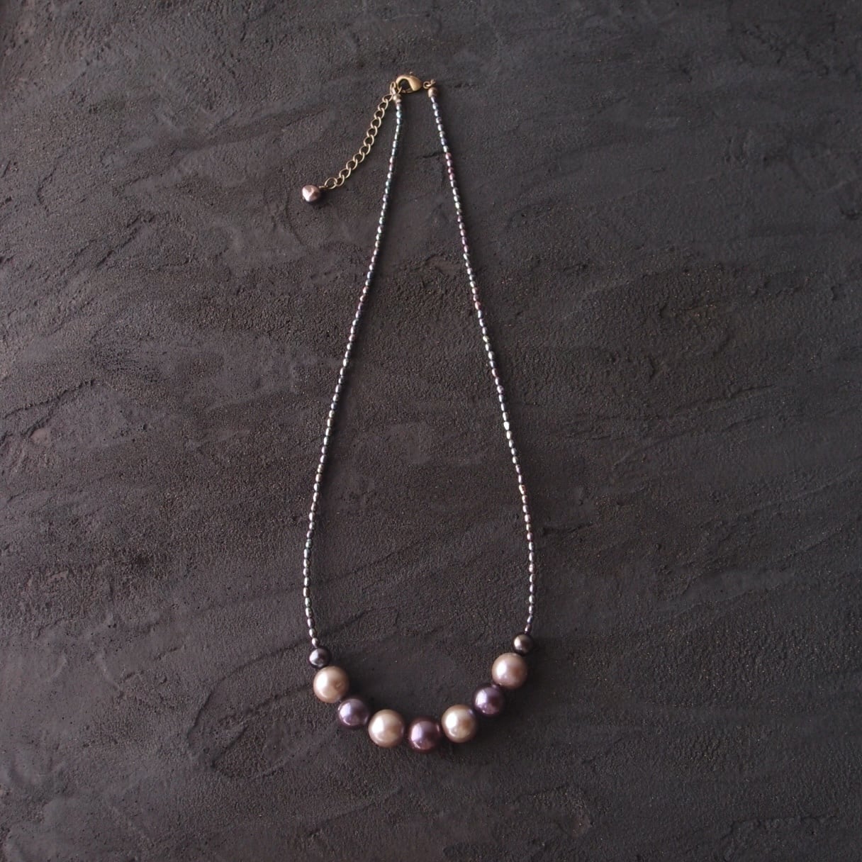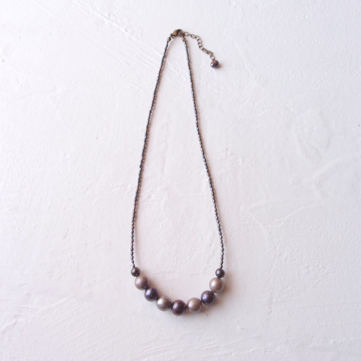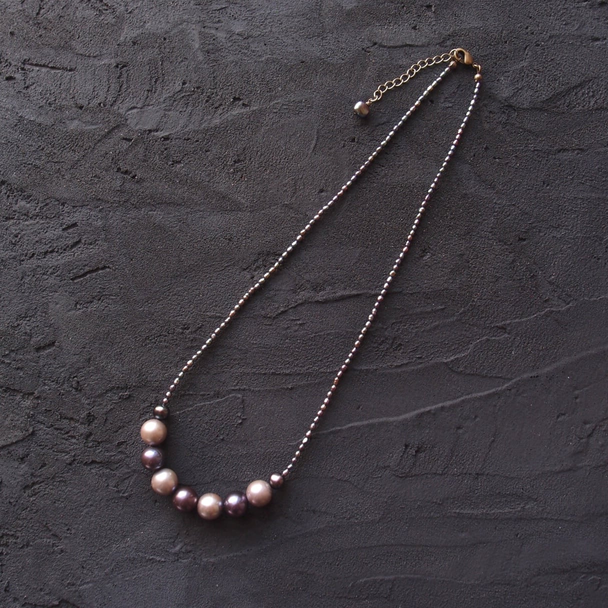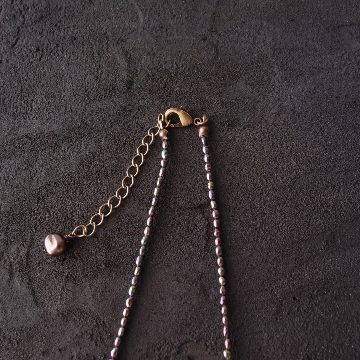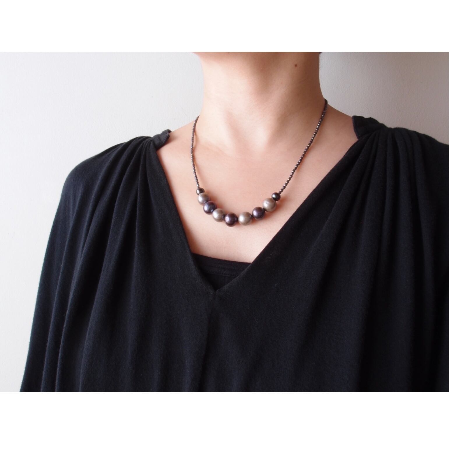 極小パールの繊細なラインに、グレージュとブラックの異なる表情をミックスした真珠のネックレス。