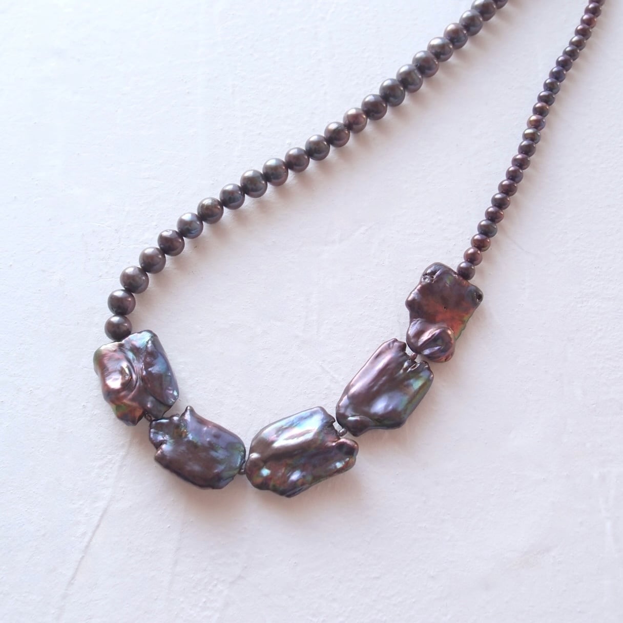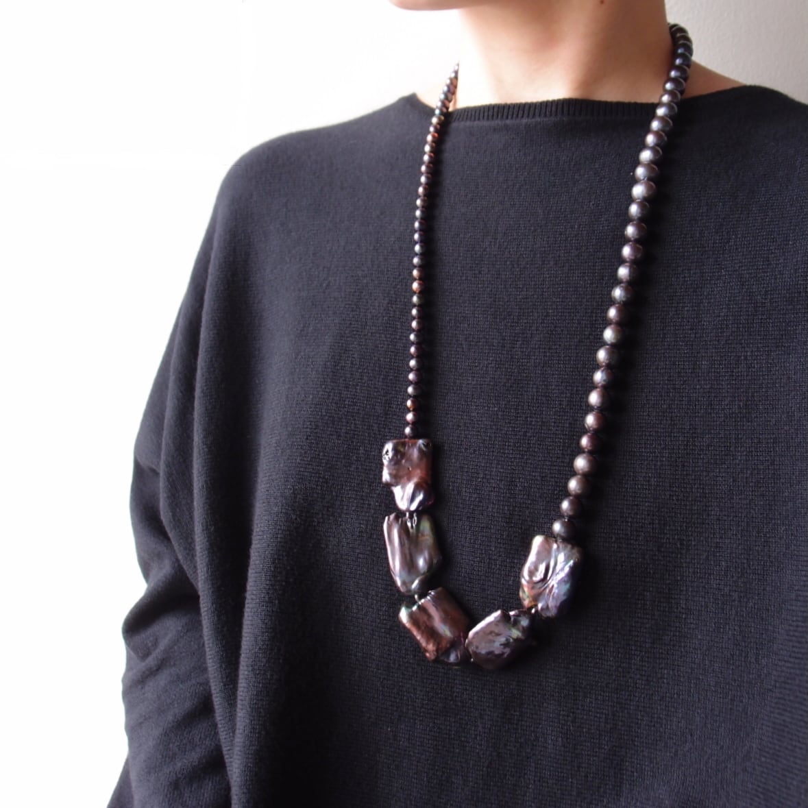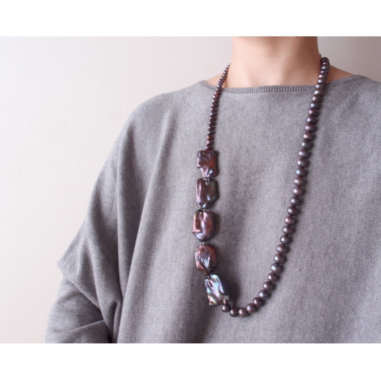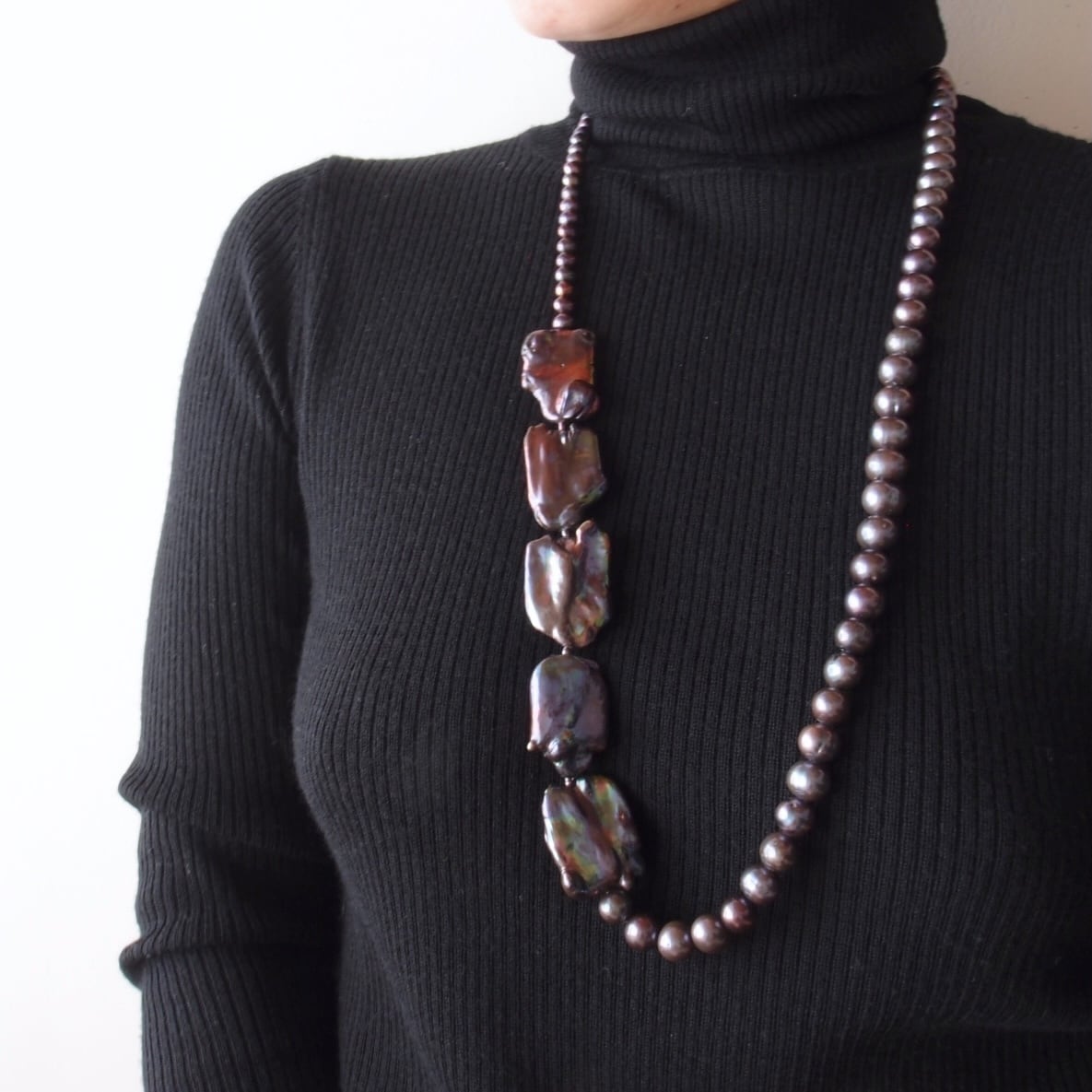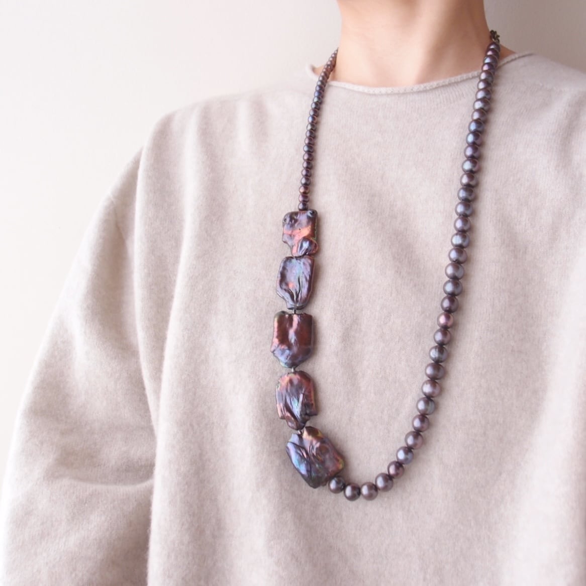 神秘的な輝きを纏う、ブラックバロックパールのロングネックレス。