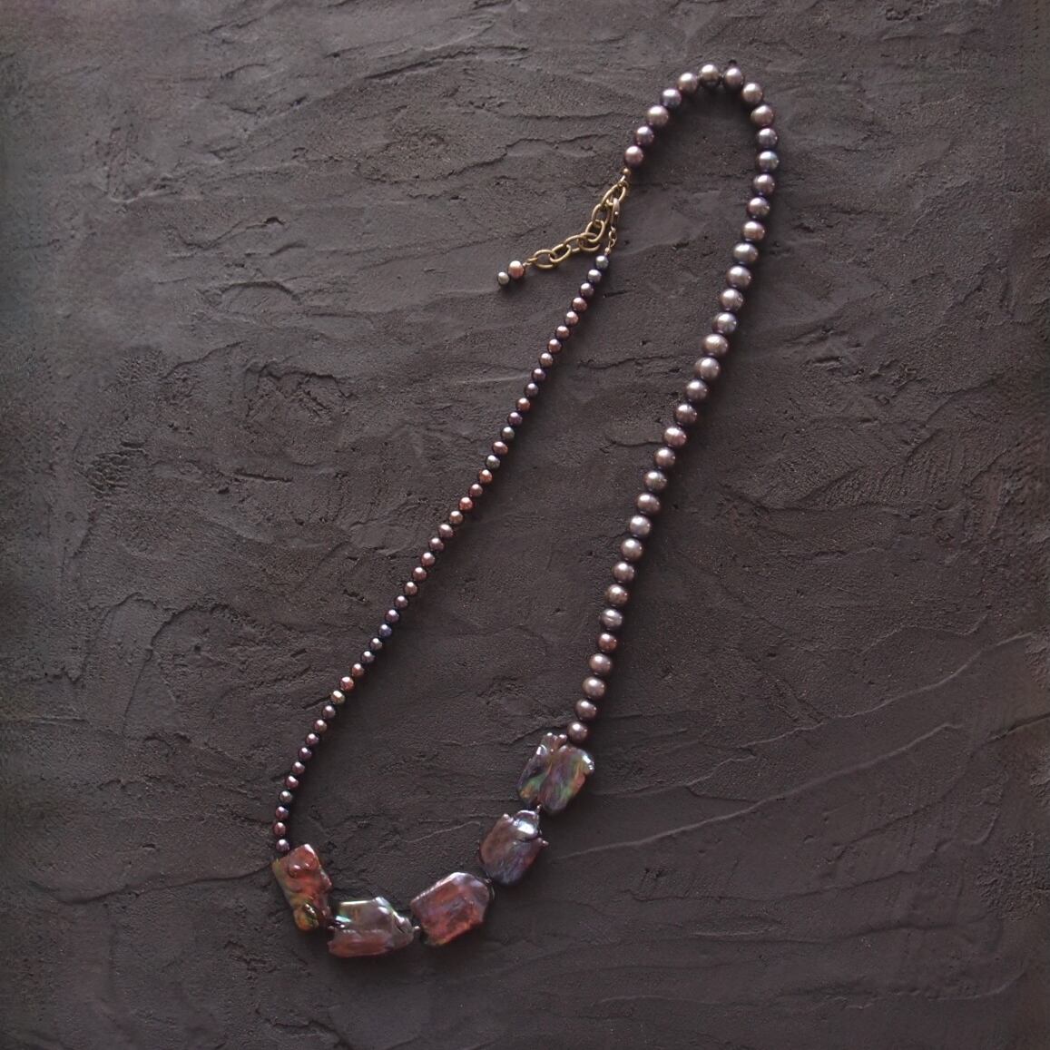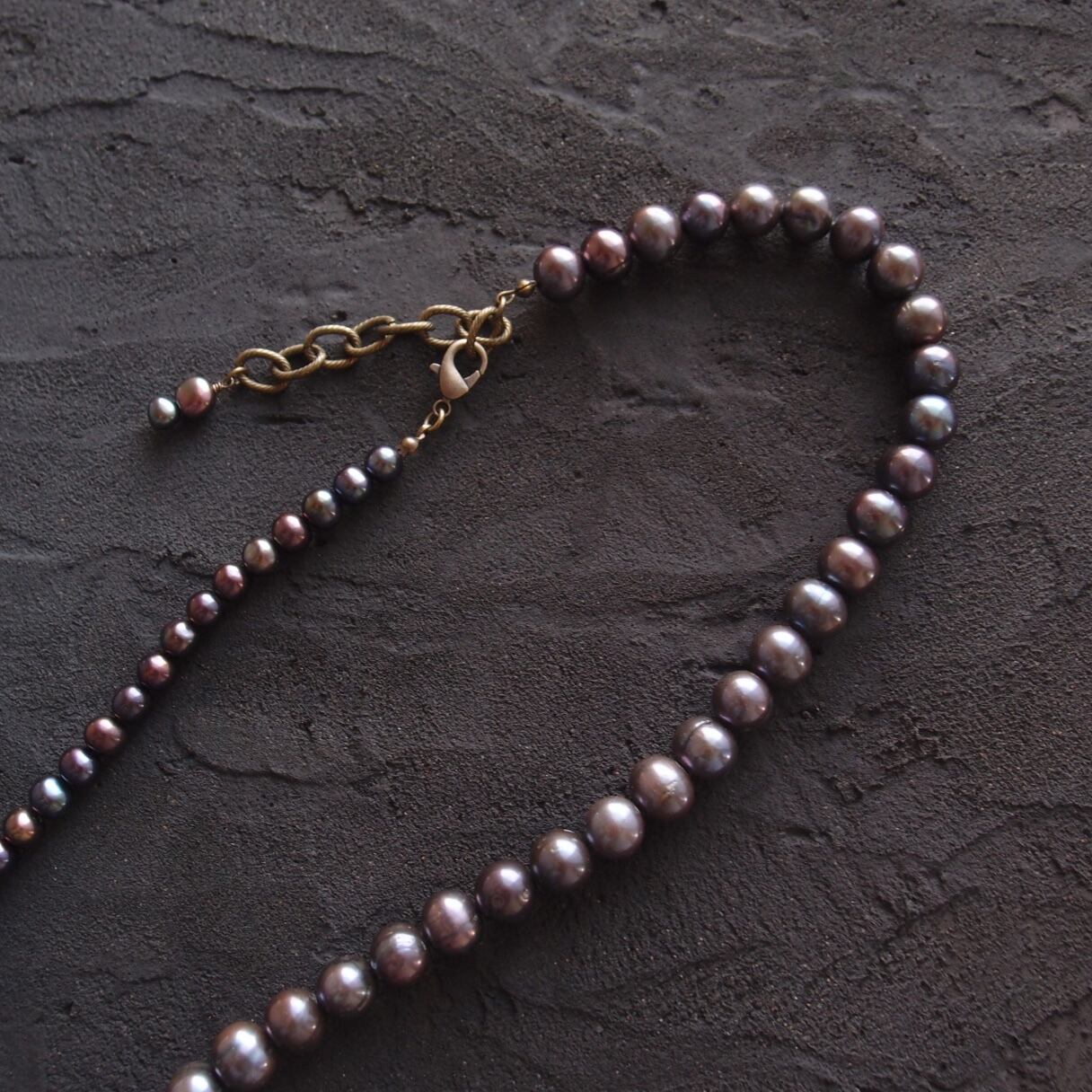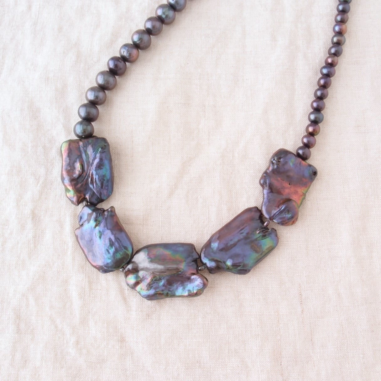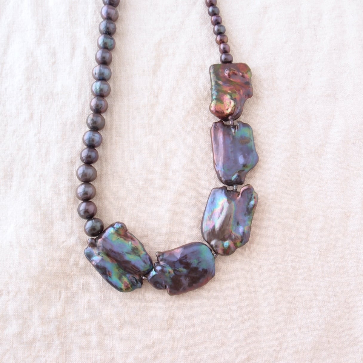 神秘的な輝きを纏う、ブラックバロックパールのロングネックレス。