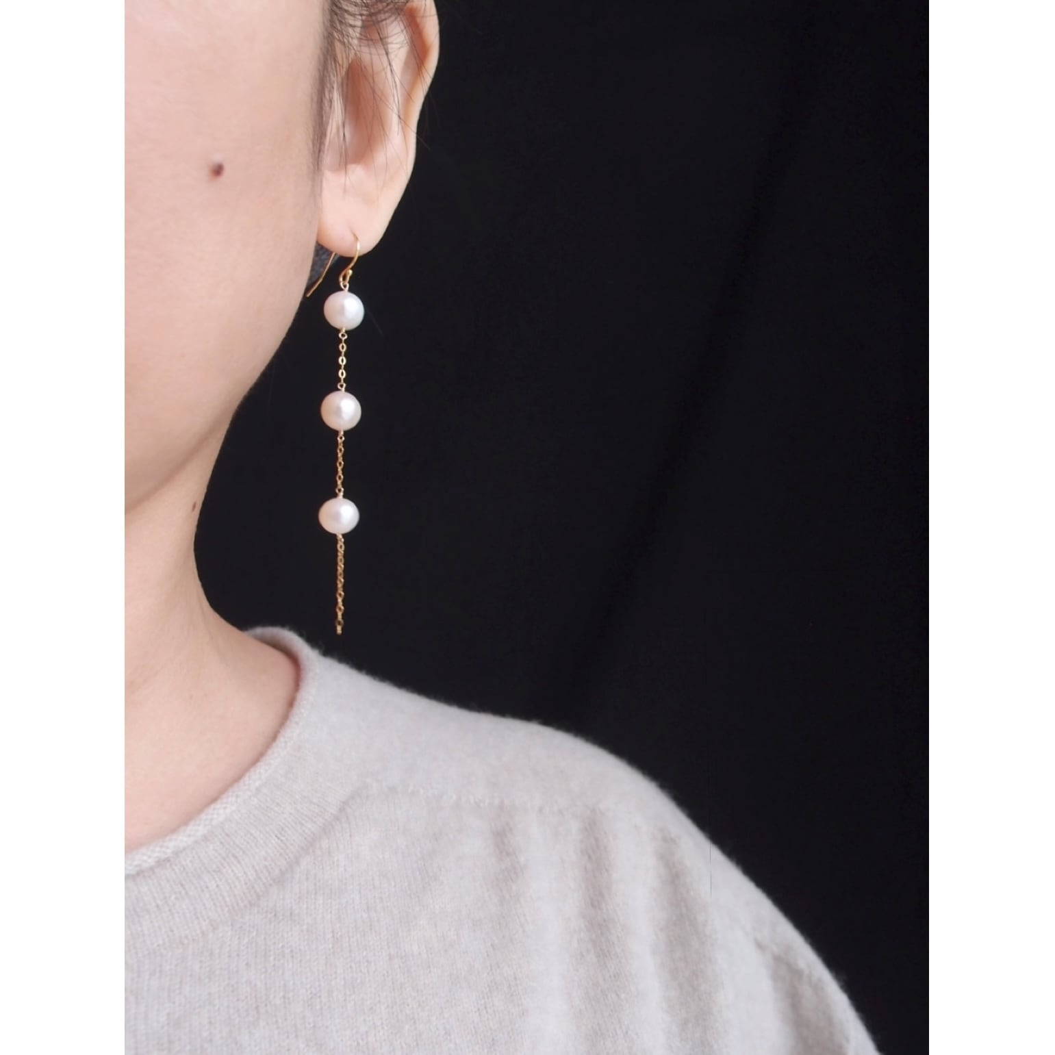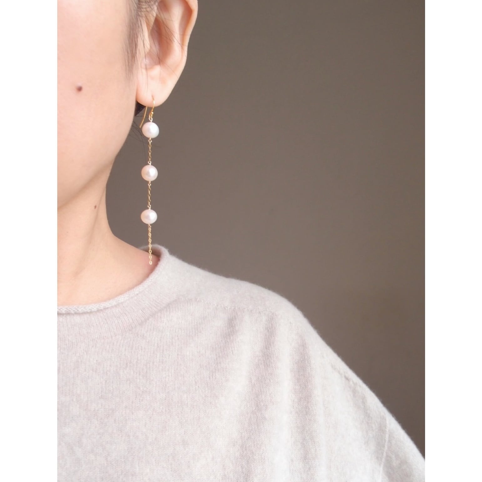 華奢なゴールドチェーンと、パールの自然な輝きが生む縦長ラインの効果で、お顔周りをシャープかつスマートな印象に導きます。