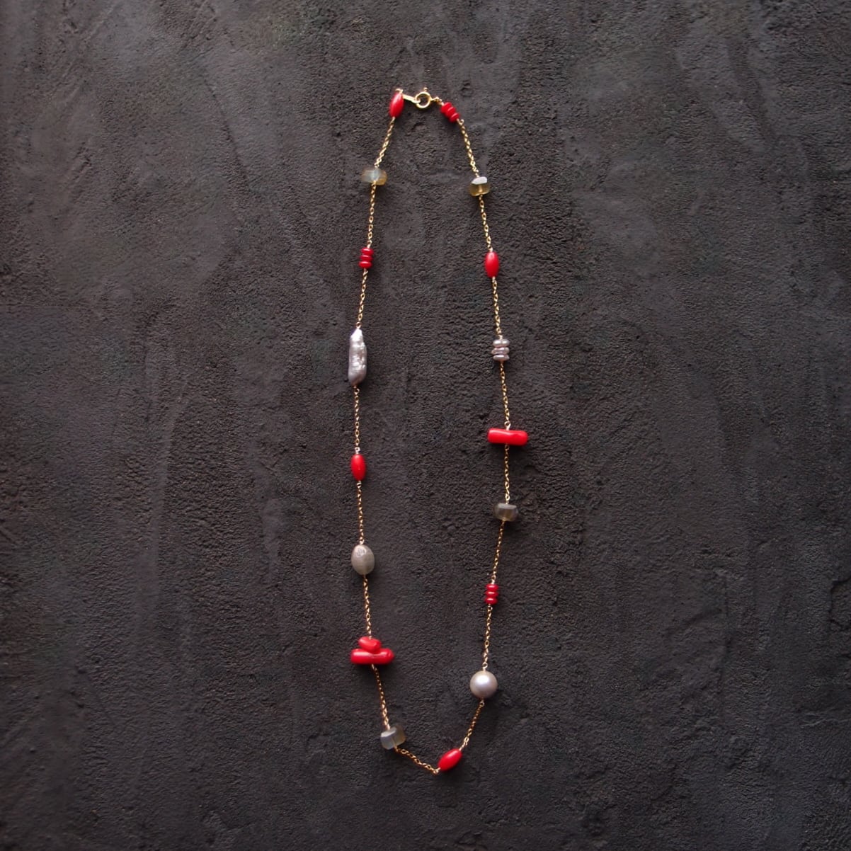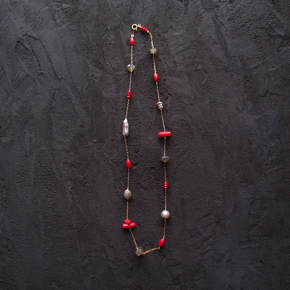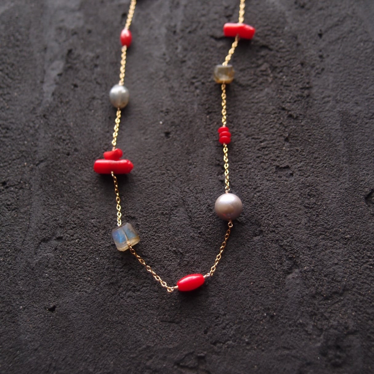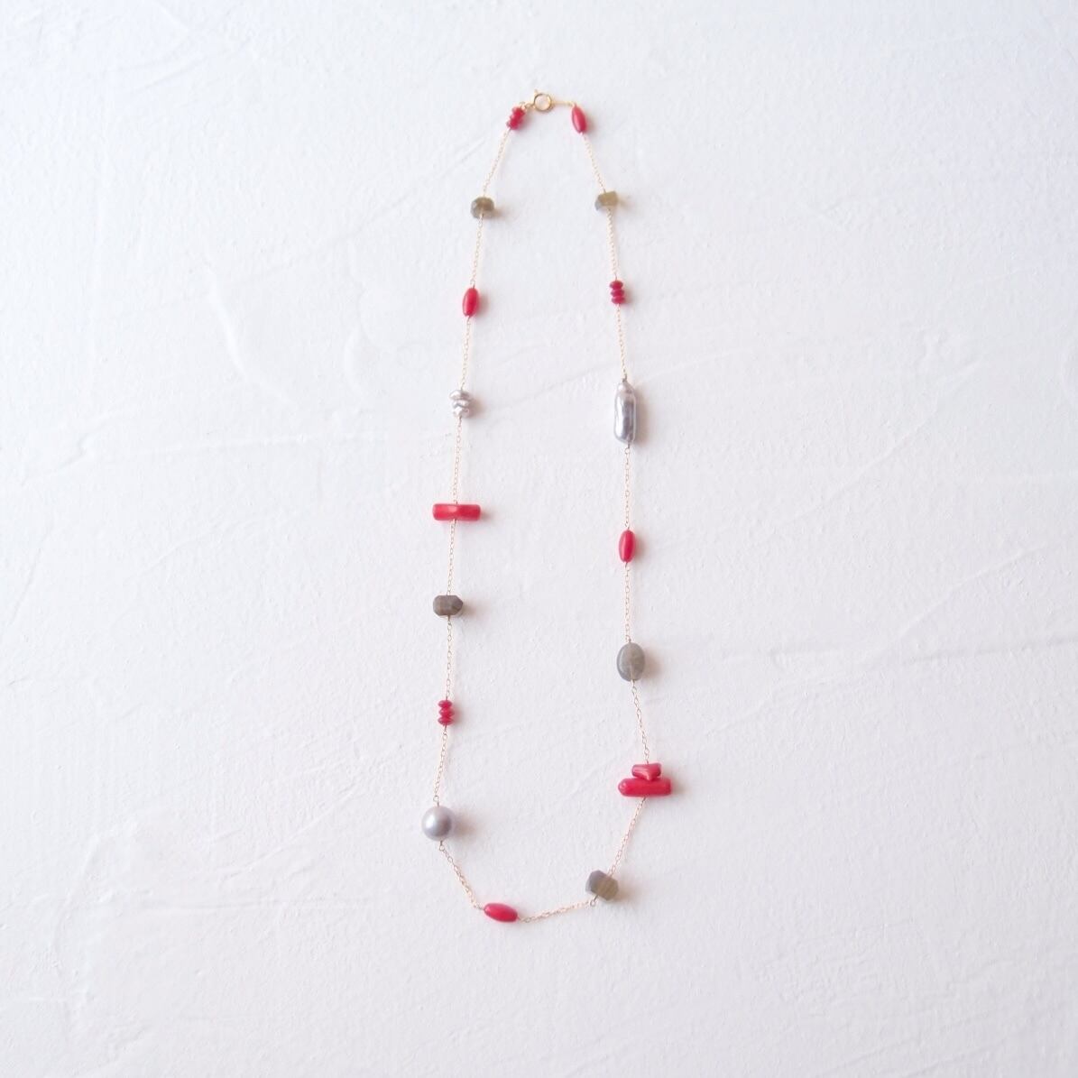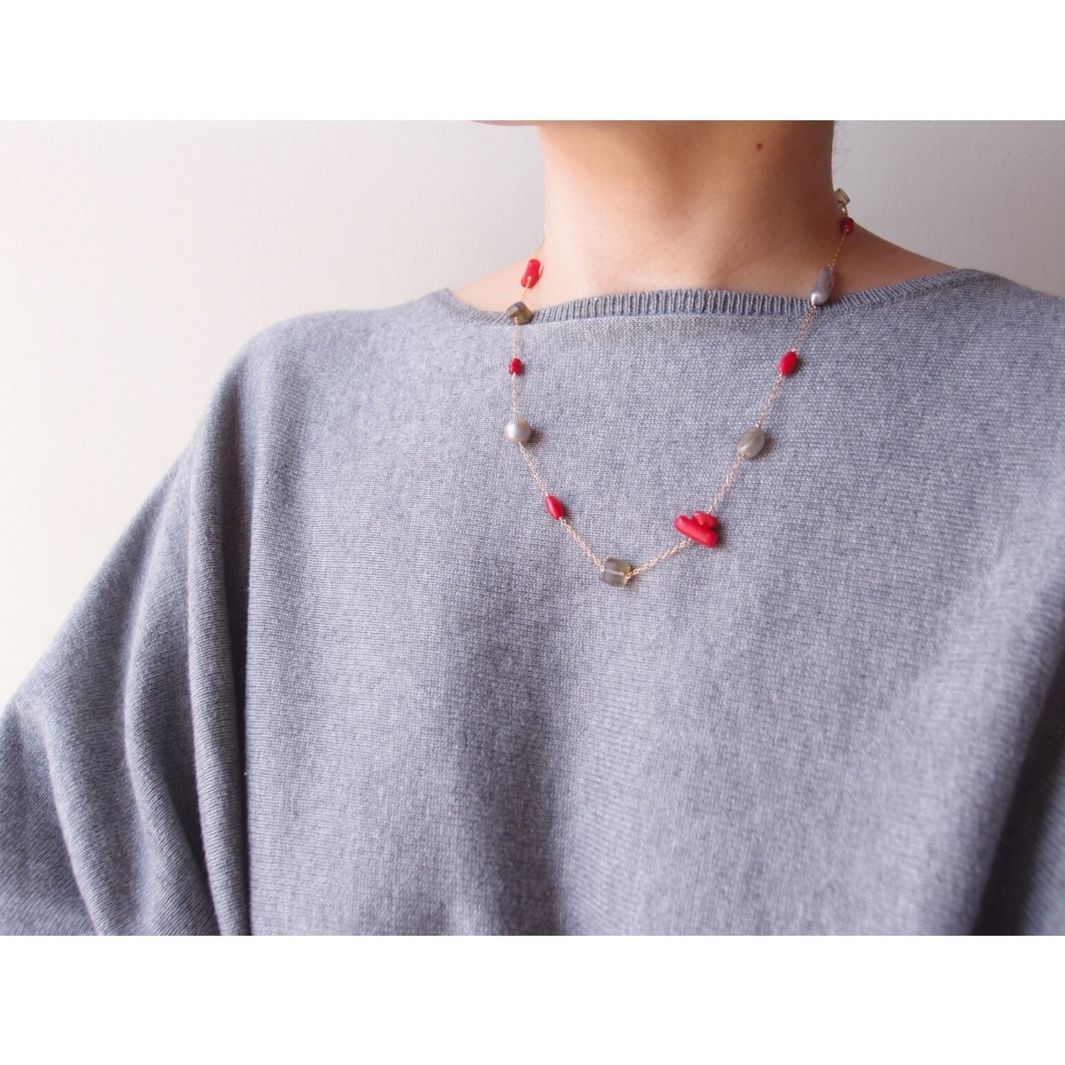 深い赤が目を引くレッドコーラルを中心に、神秘的なシラーが輝くラブラドライト、気品あるグレーパールなど8種類の天然石をリズミカルに配したステーションネックレス。