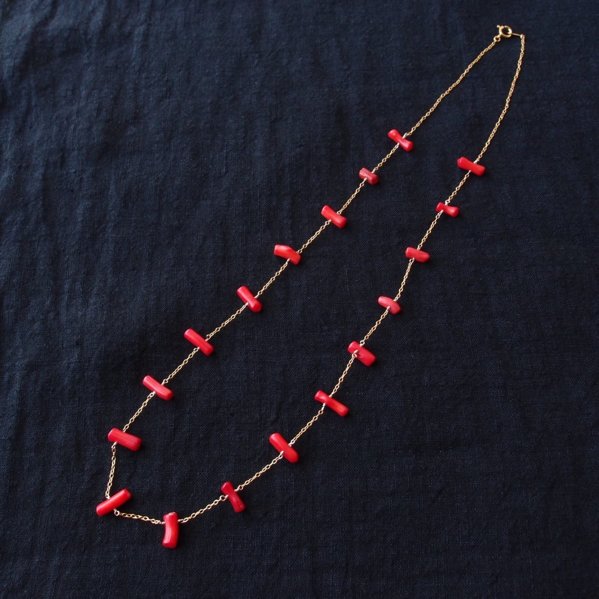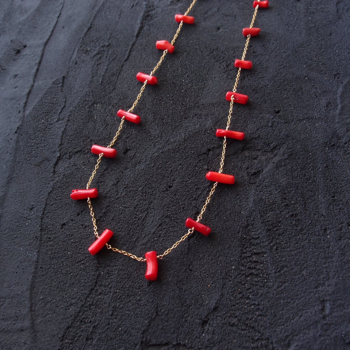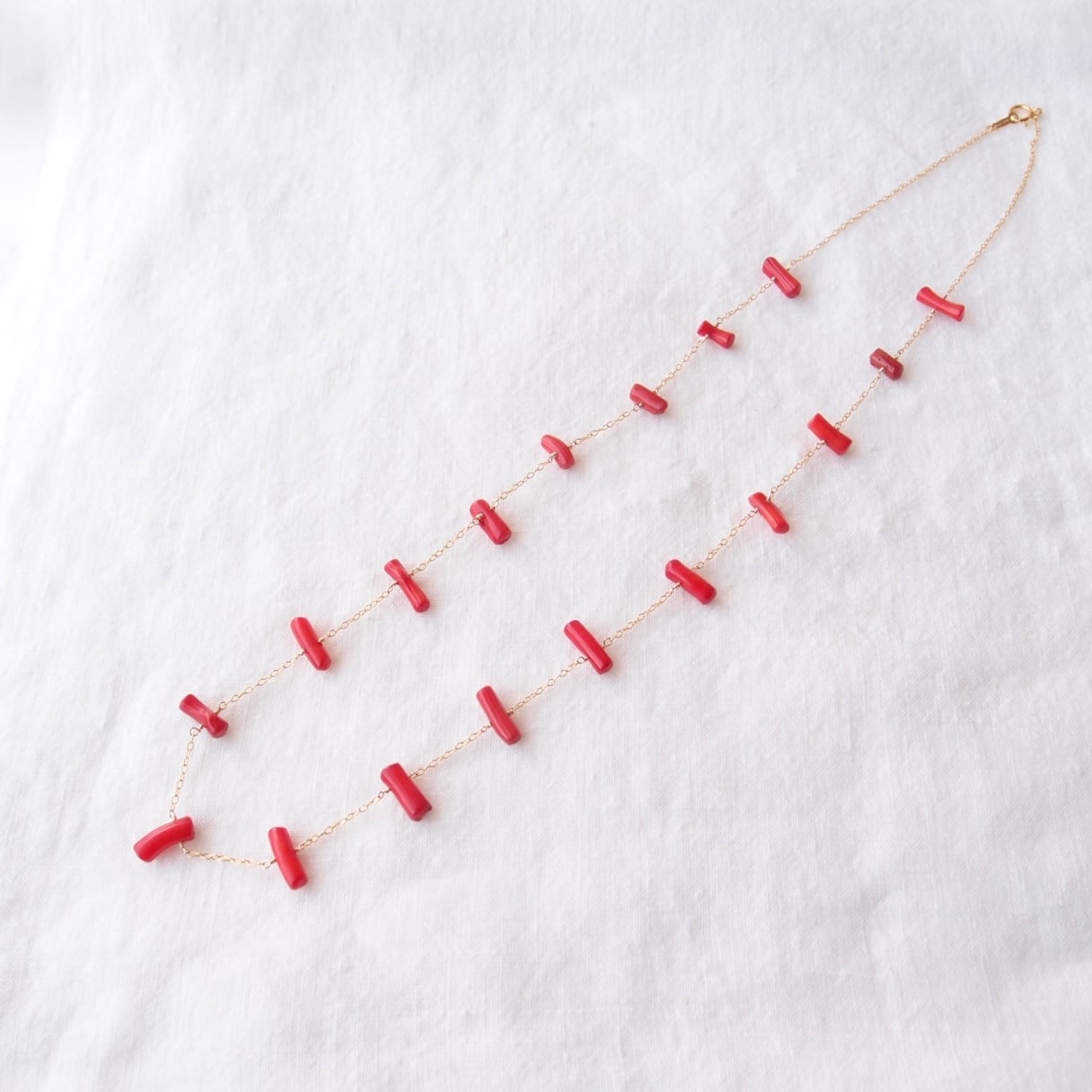 レッドコーラルの小さな枝を贅沢に散りばめた、極細ゴールドチェーンのステーションネックレス。