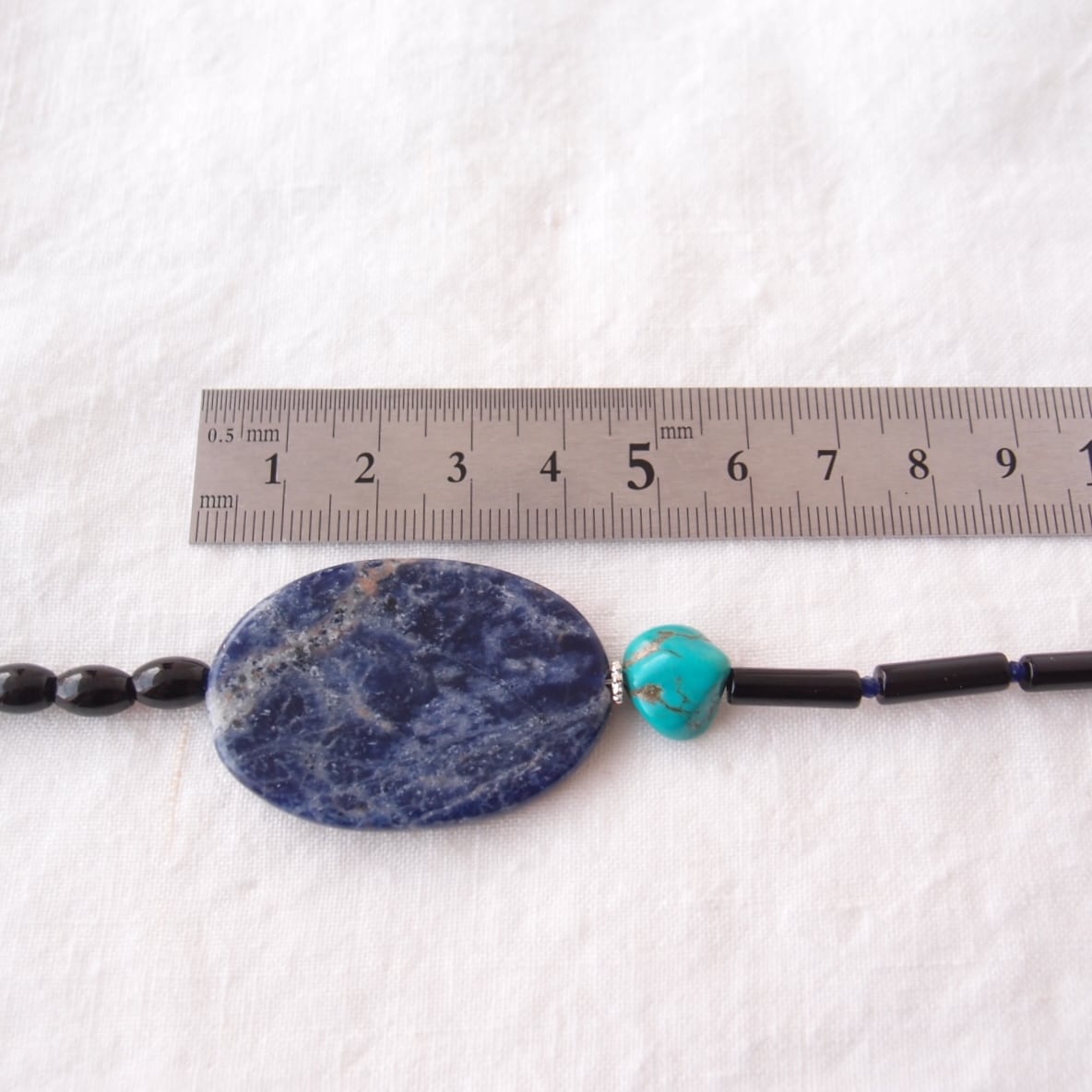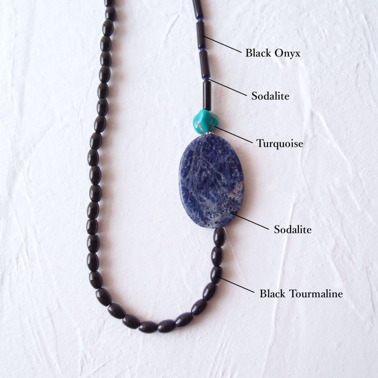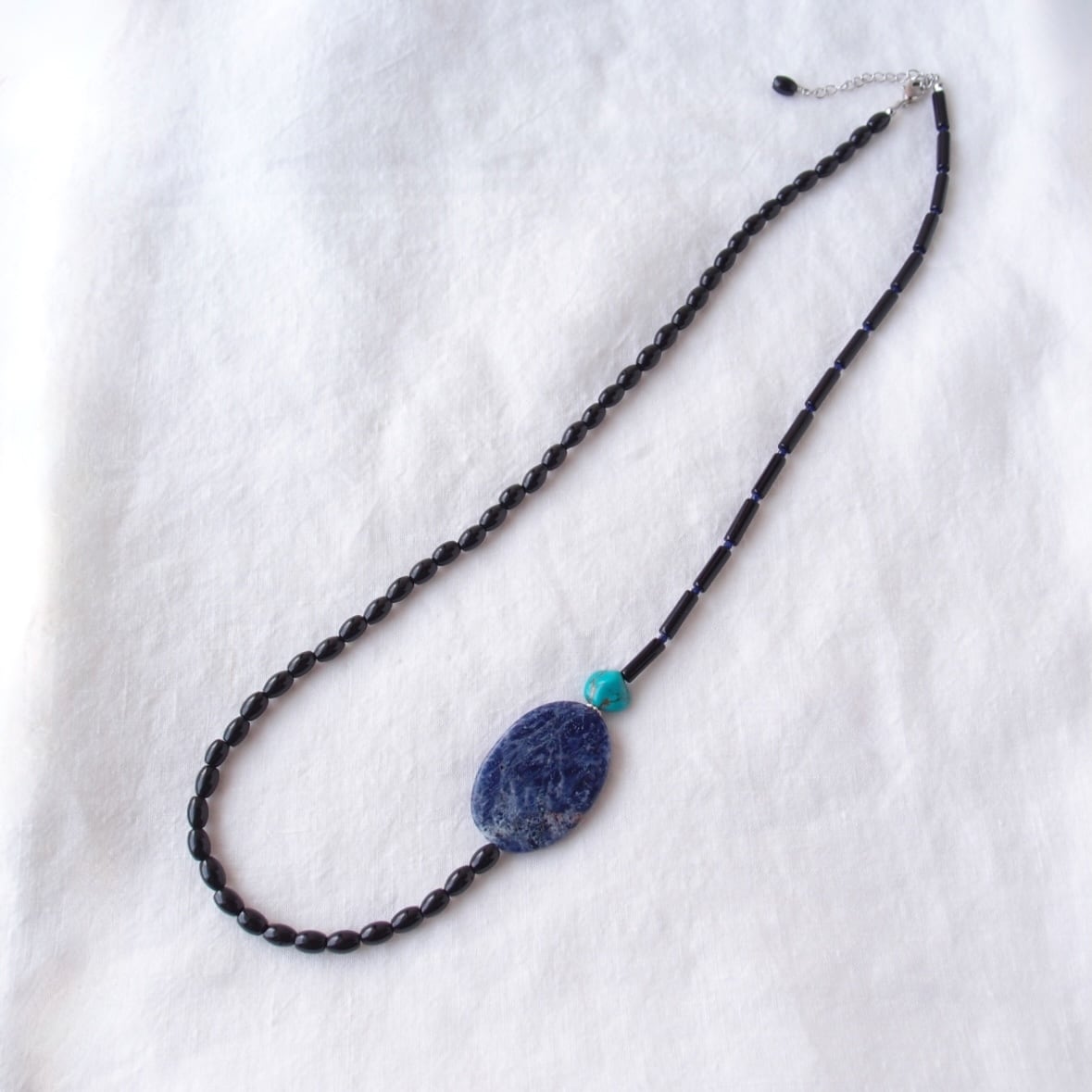 夜空を思わせるソーダライトのブルー、鮮やかなターコイズのアクセント、それを引き締める漆黒のトルマリンとオニキス。自分だけの特別な一品をお探しの方へおすすめしたいアクセサリーです。