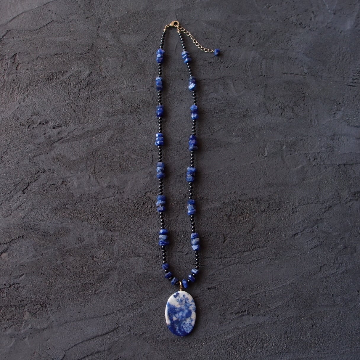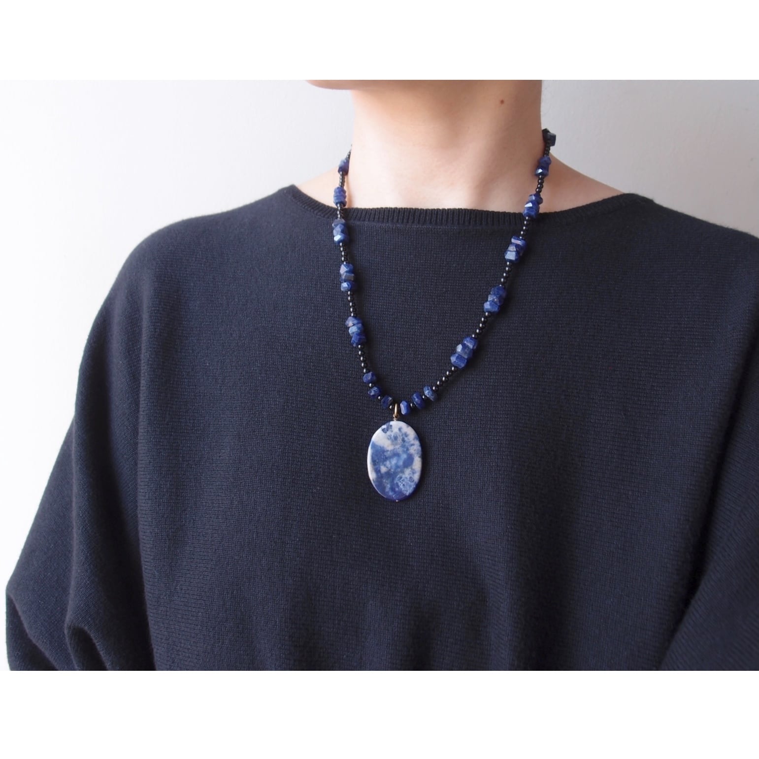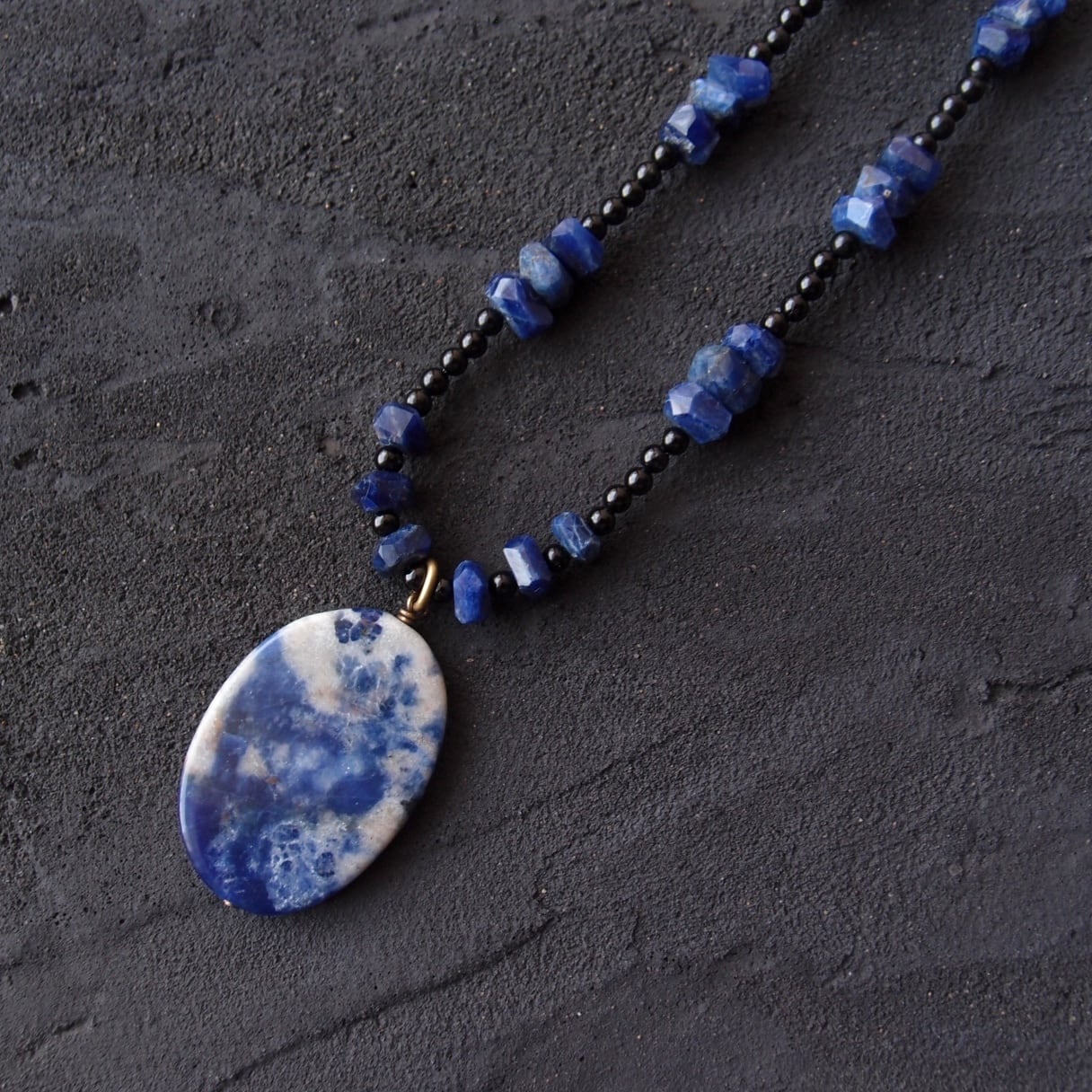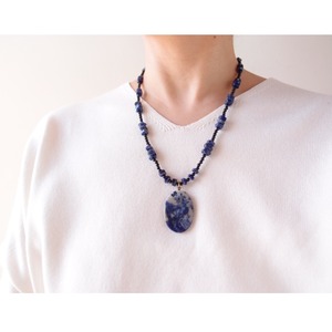 深い藍色に煙のような白い模様が浮かぶソーダライトに、高級感のあるブラックトルマリンのベースを組み合わせたペンダントネックレスです。
