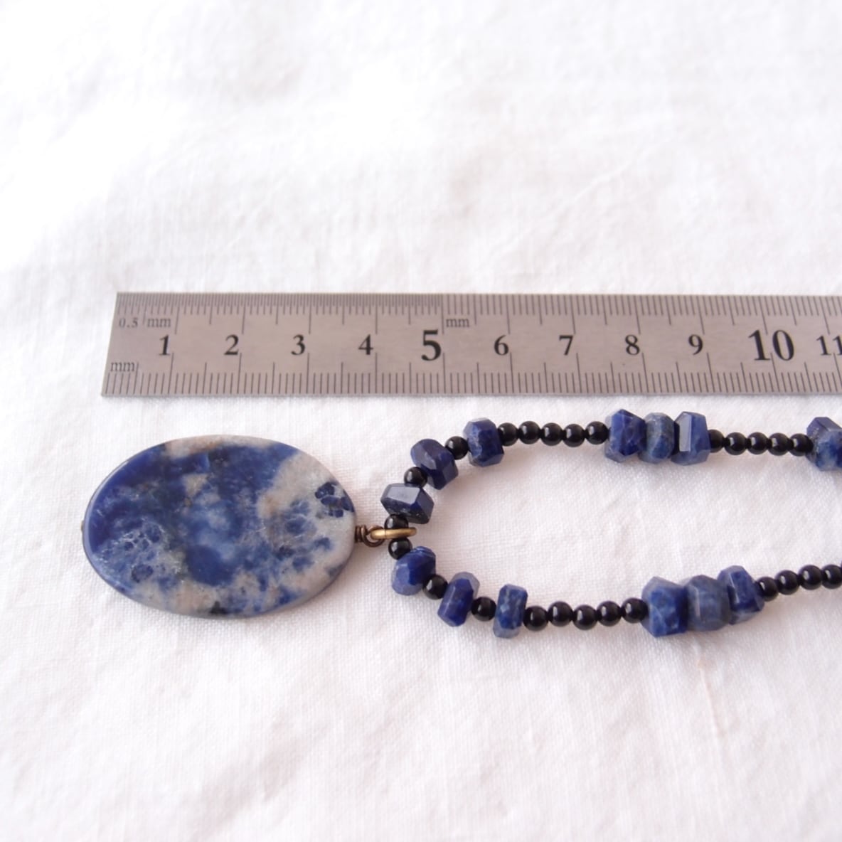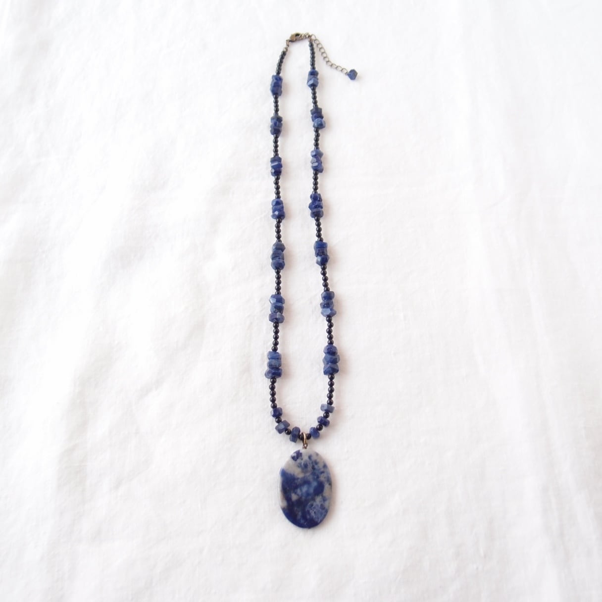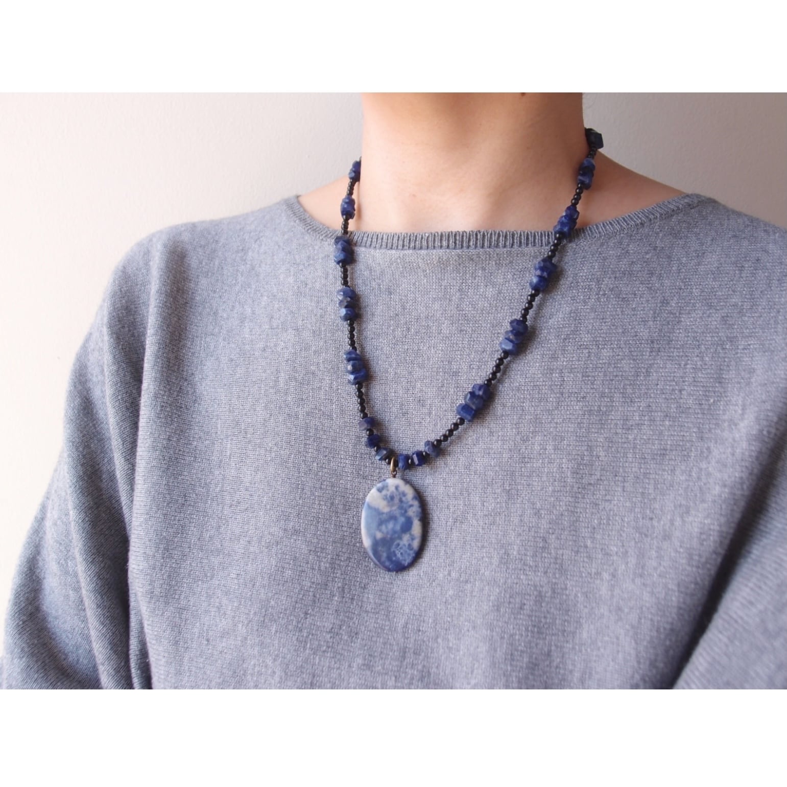 深い藍色に煙のような白い模様が浮かぶソーダライトに、高級感のあるブラックトルマリンのベースを組み合わせたペンダントネックレスです。