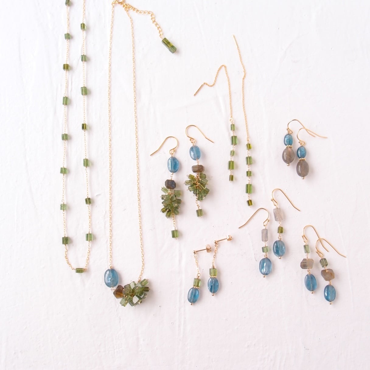 瑞々しいグリーントルマリンのキューブ、シルキーな光沢が美しいカイヤナイト、そして神秘的なブルーシラーを宿すラブラドライト。