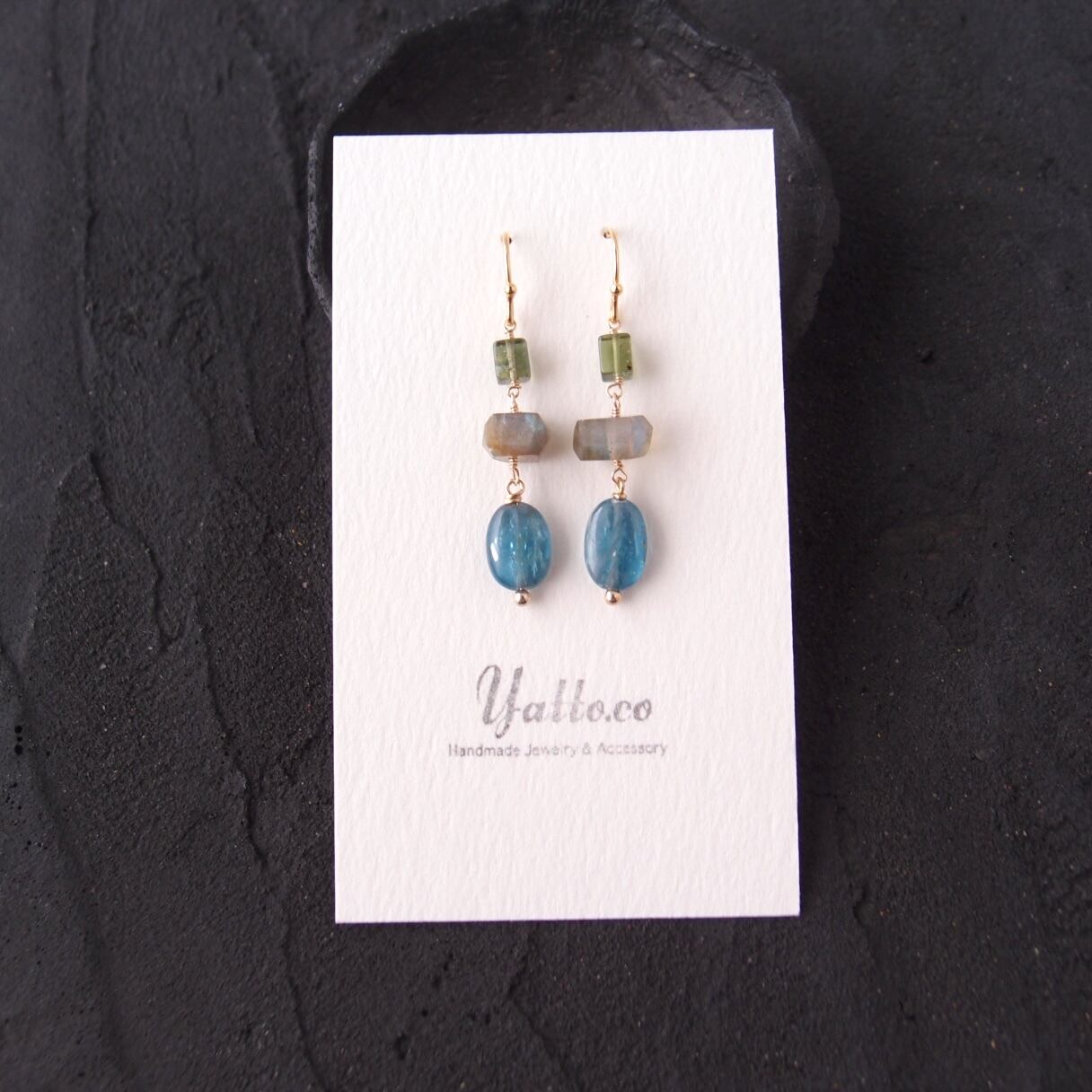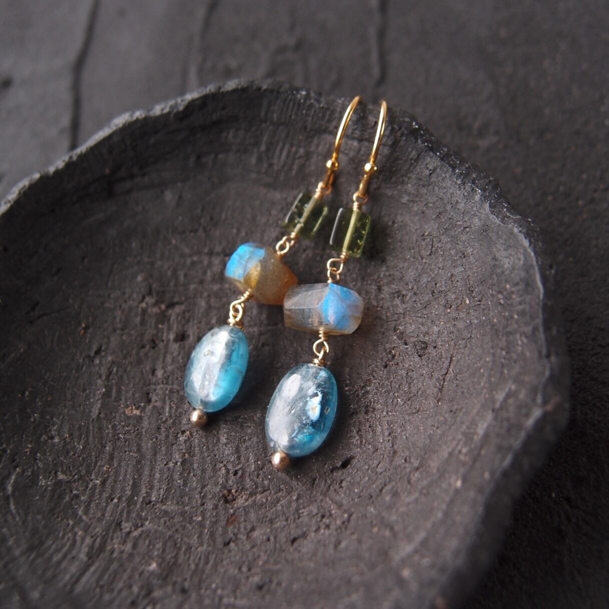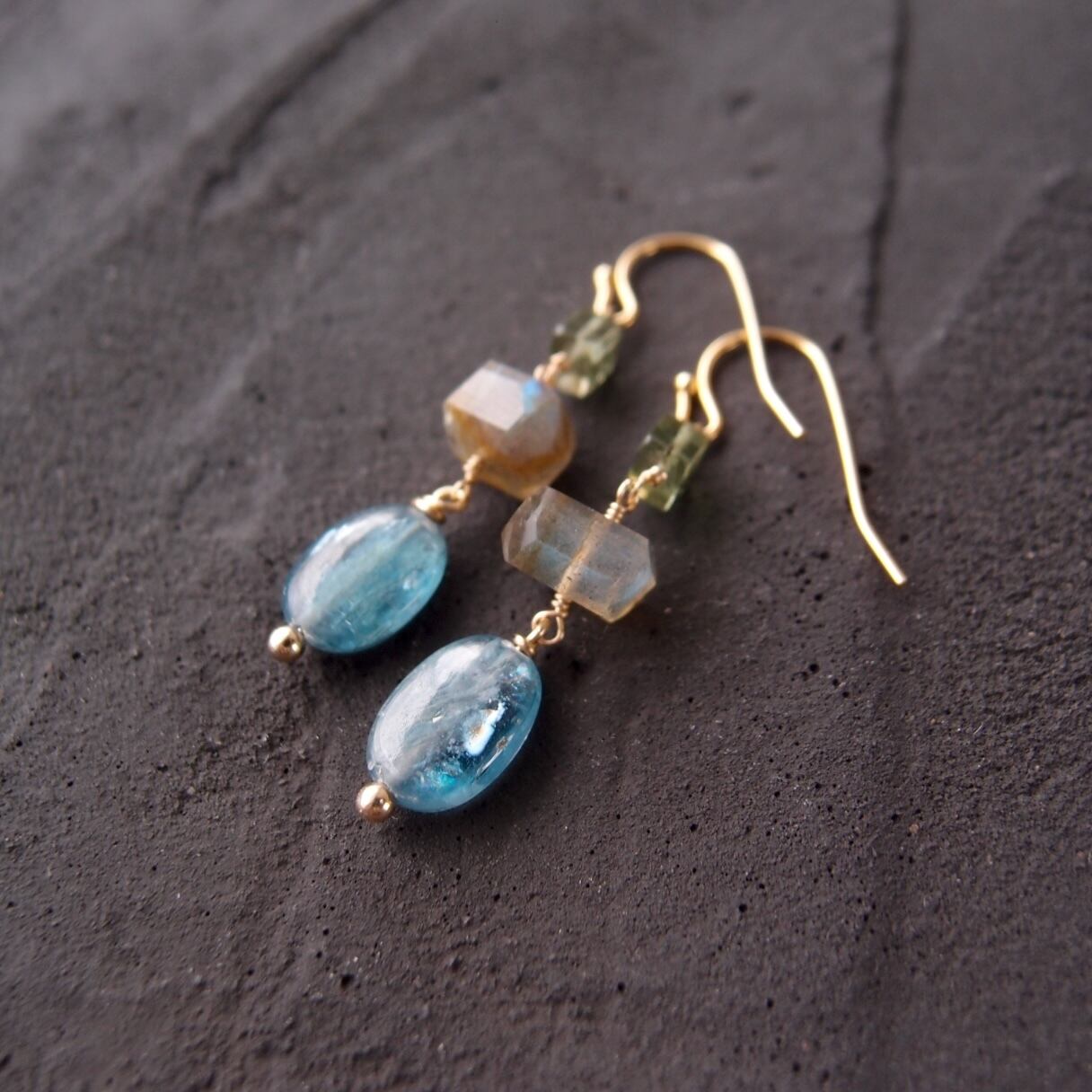 落ち着いた色調のグリーントルマリン、ブルーシラー輝くラブラドライト、深みのあるブルーカイヤナイトが揺れるデイリーなフックピアス。