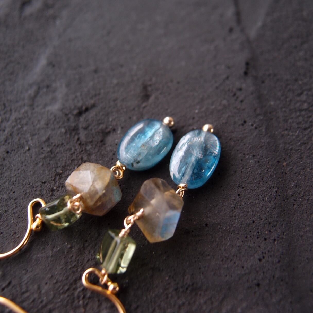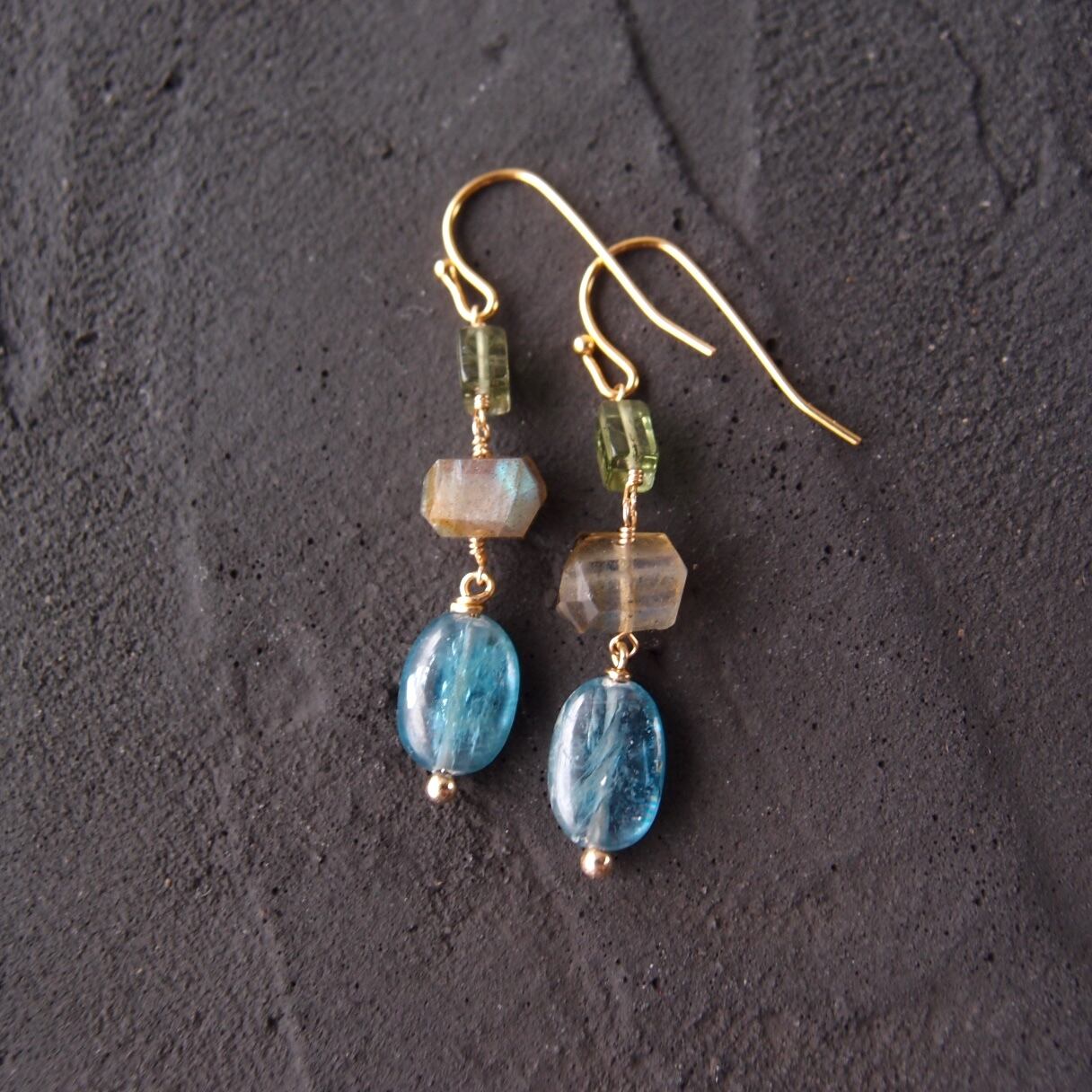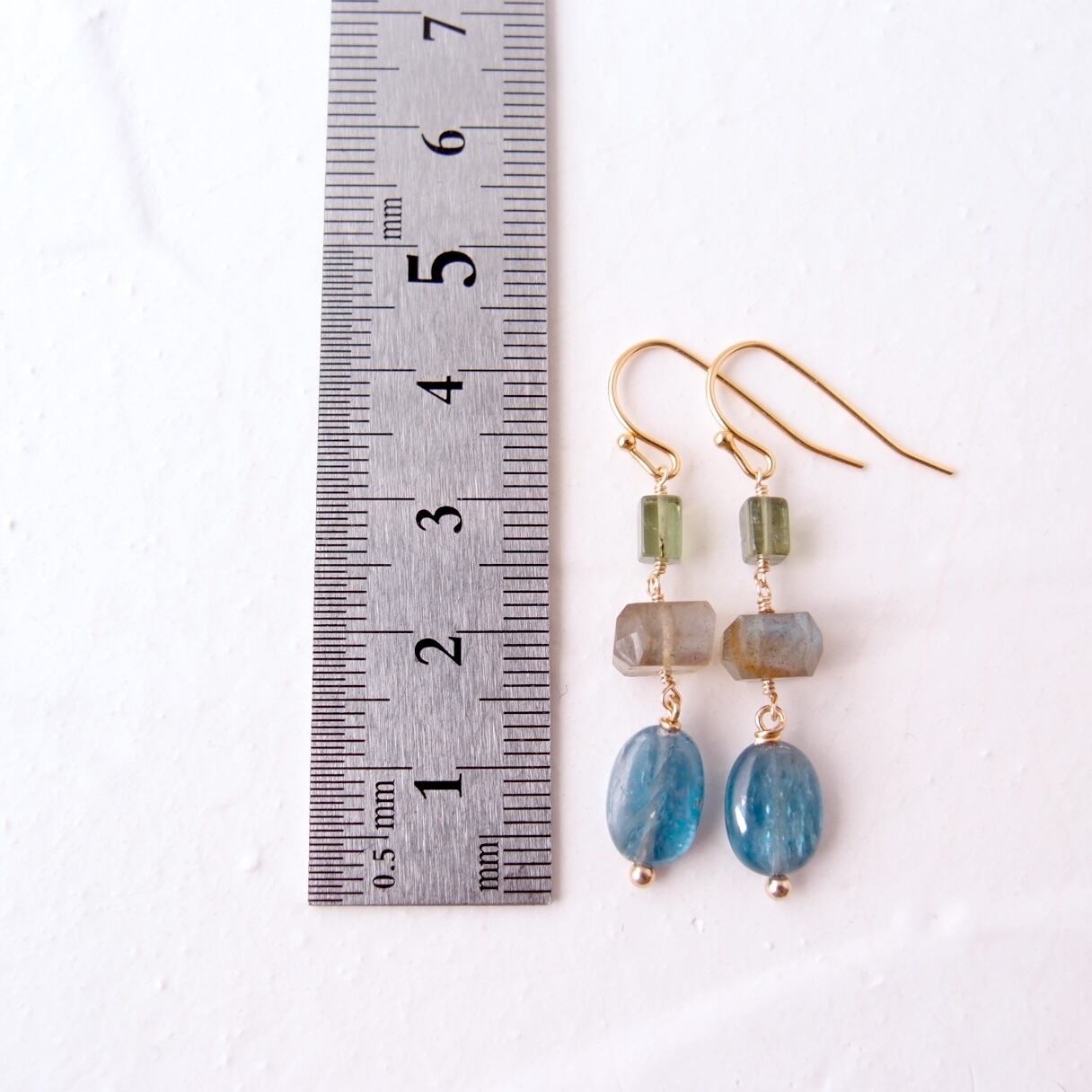 落ち着いた色調のグリーントルマリン、ブルーシラー輝くラブラドライト、深みのあるブルーカイヤナイトが揺れるデイリーなフックピアス。