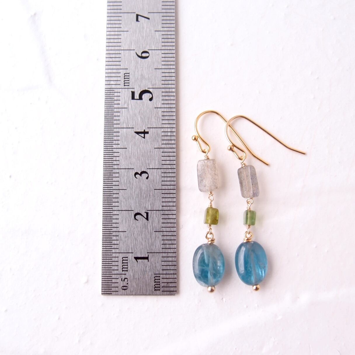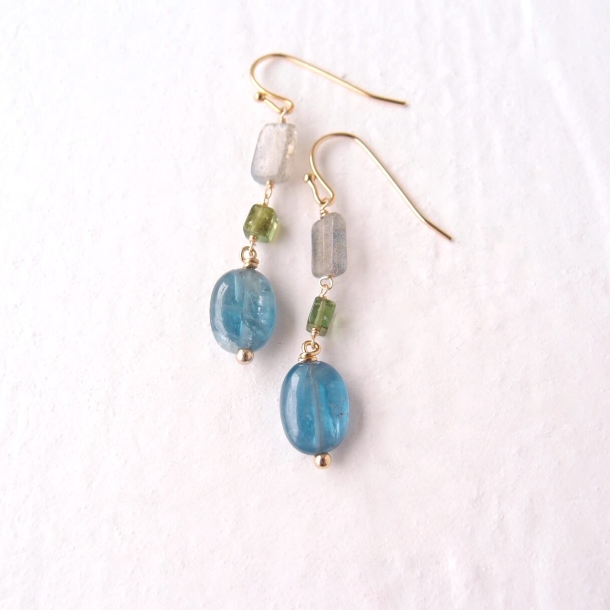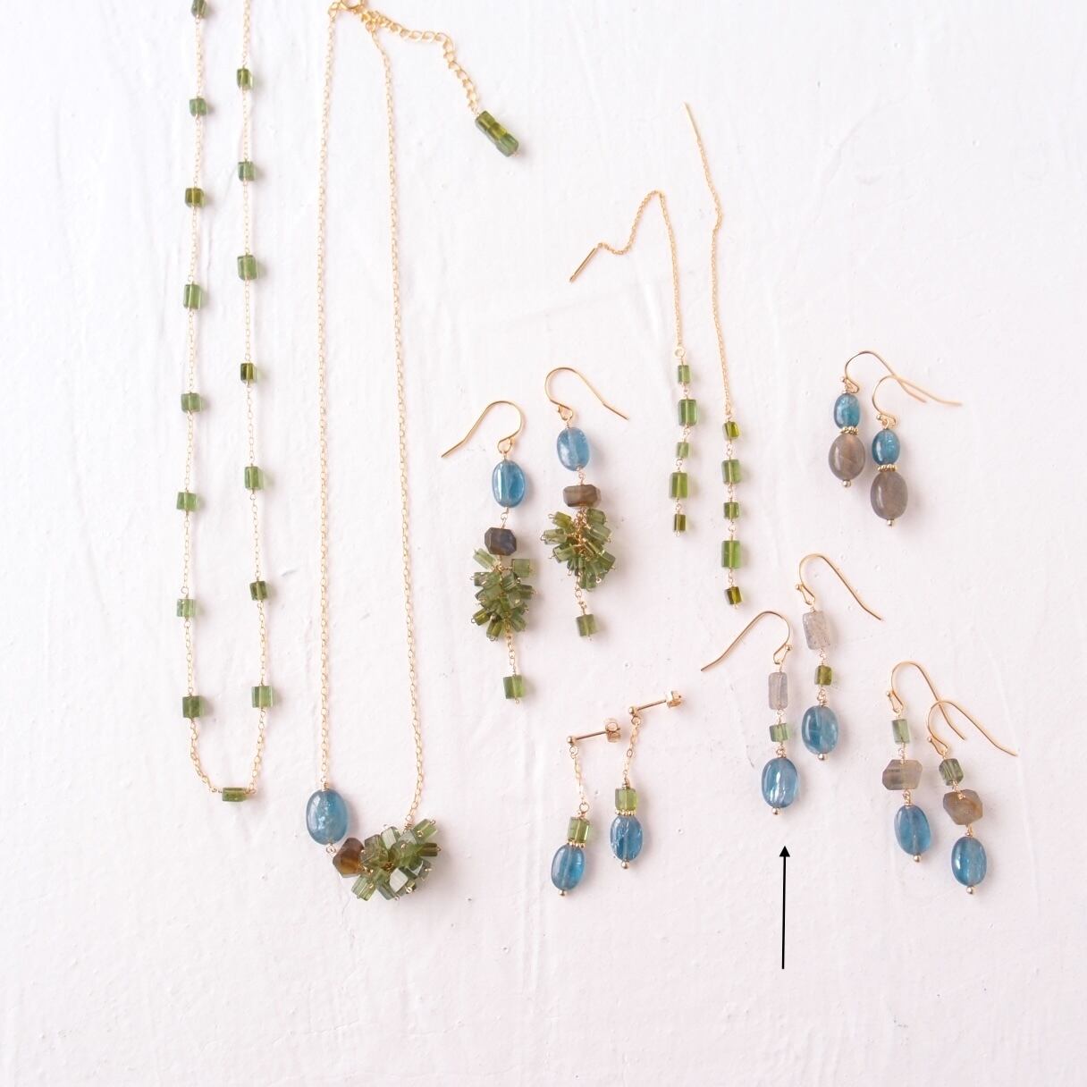 落ち着いた色調のラブラドライトとグリーントルマリンの先に、深みのあるブルーカイヤナイトが揺れるデイリーなフックピアス。