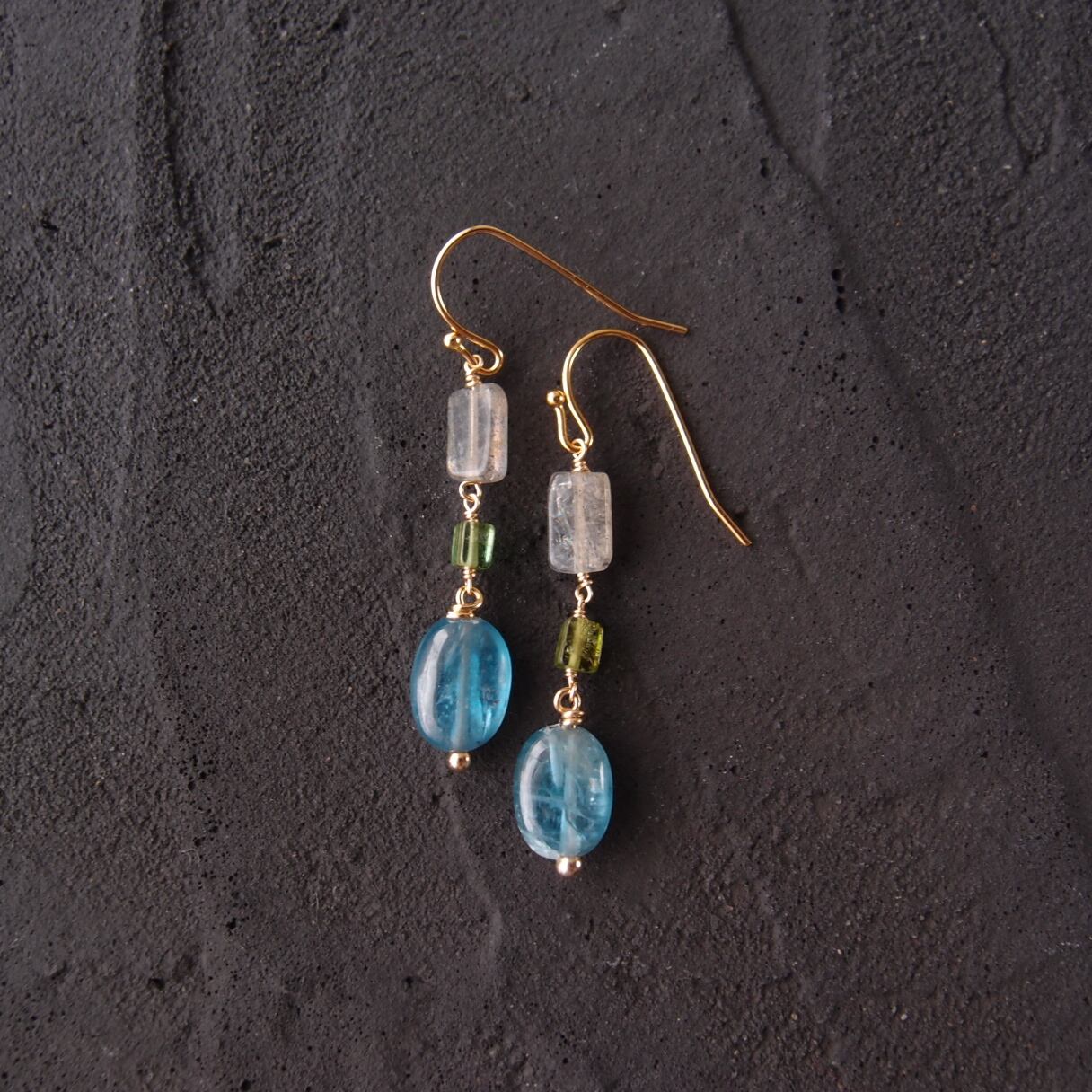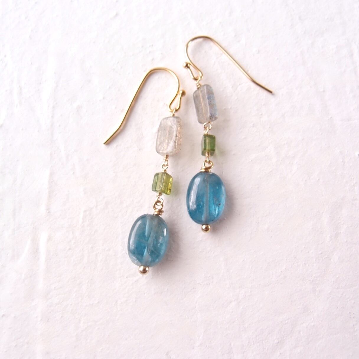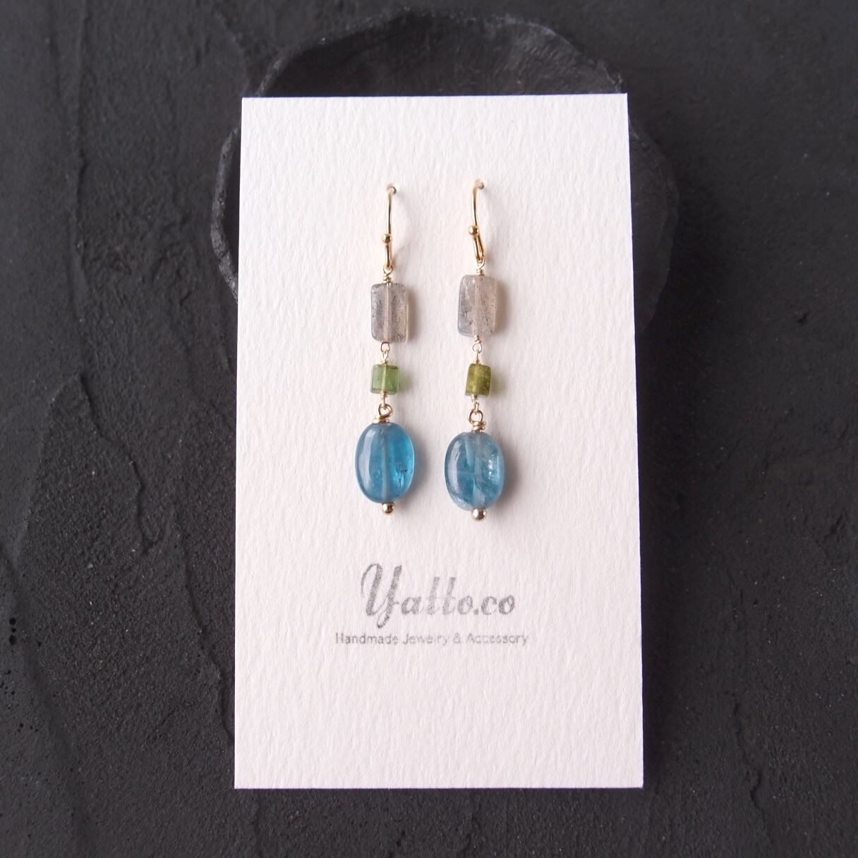 落ち着いた色調のラブラドライトとグリーントルマリンの先に、深みのあるブルーカイヤナイトが揺れるデイリーなフックピアス。