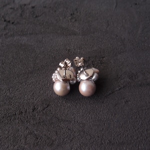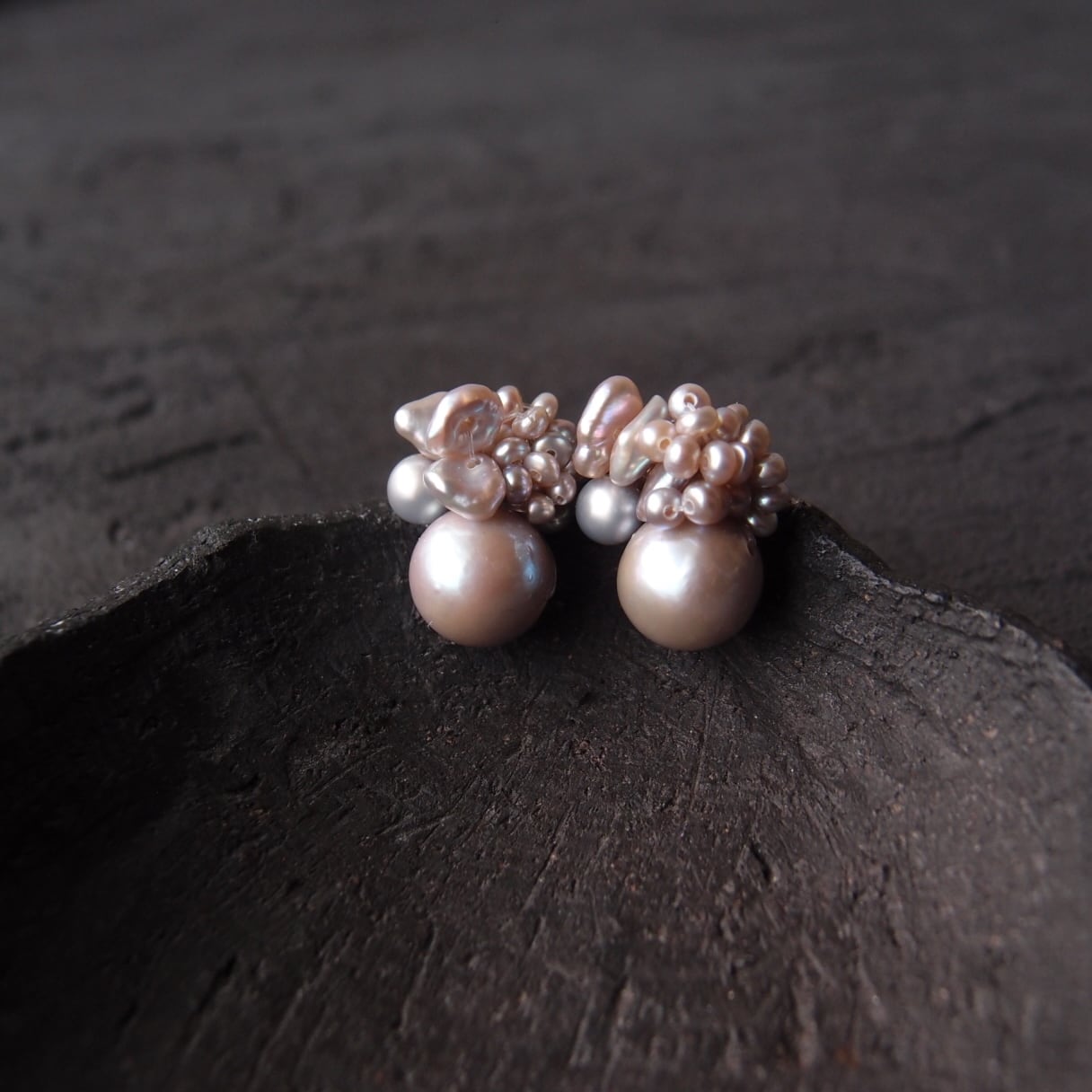 ひと粒のラウンドパールを主役に、ふんわりと上品なニュアンスグレーでまとめた刺繍ピアス。