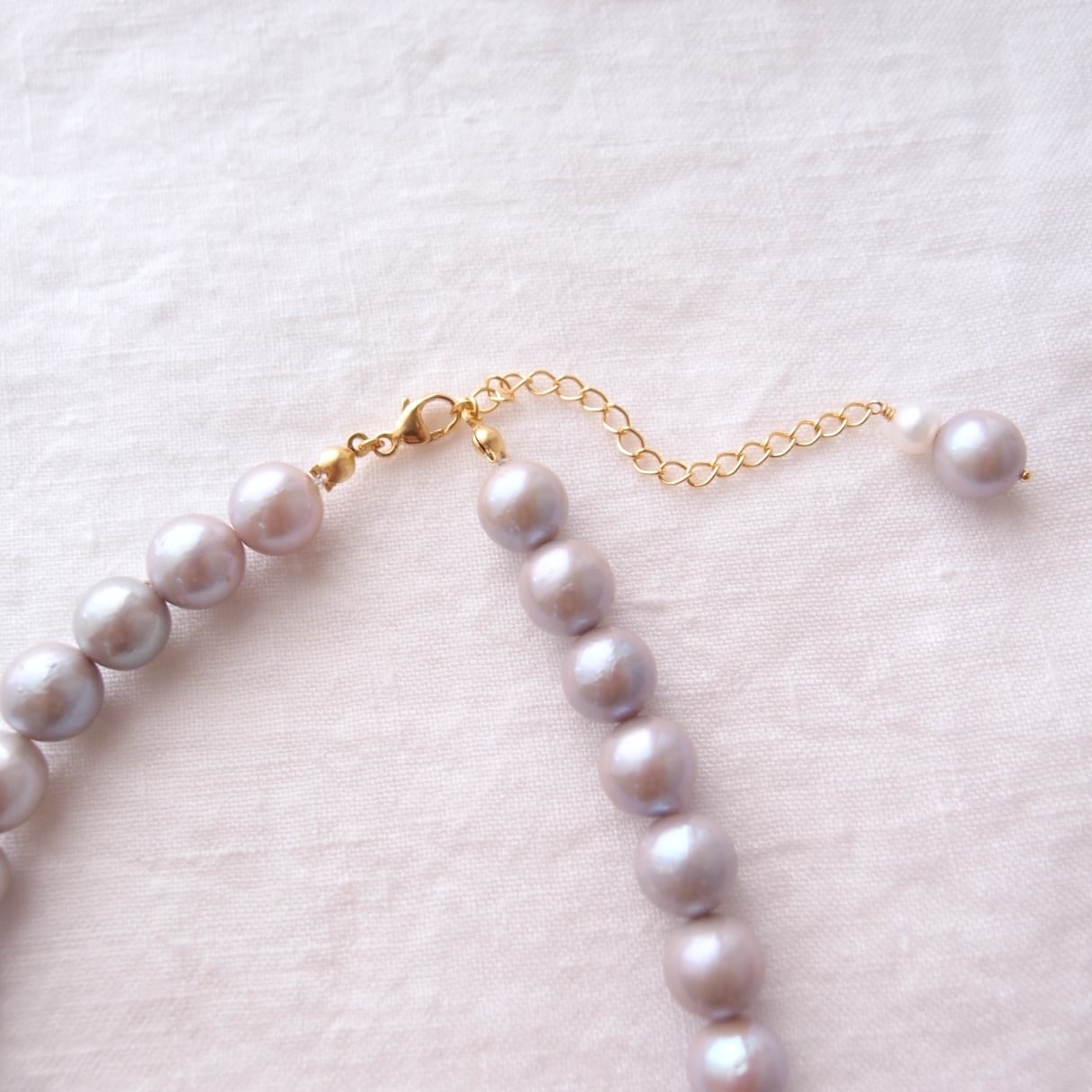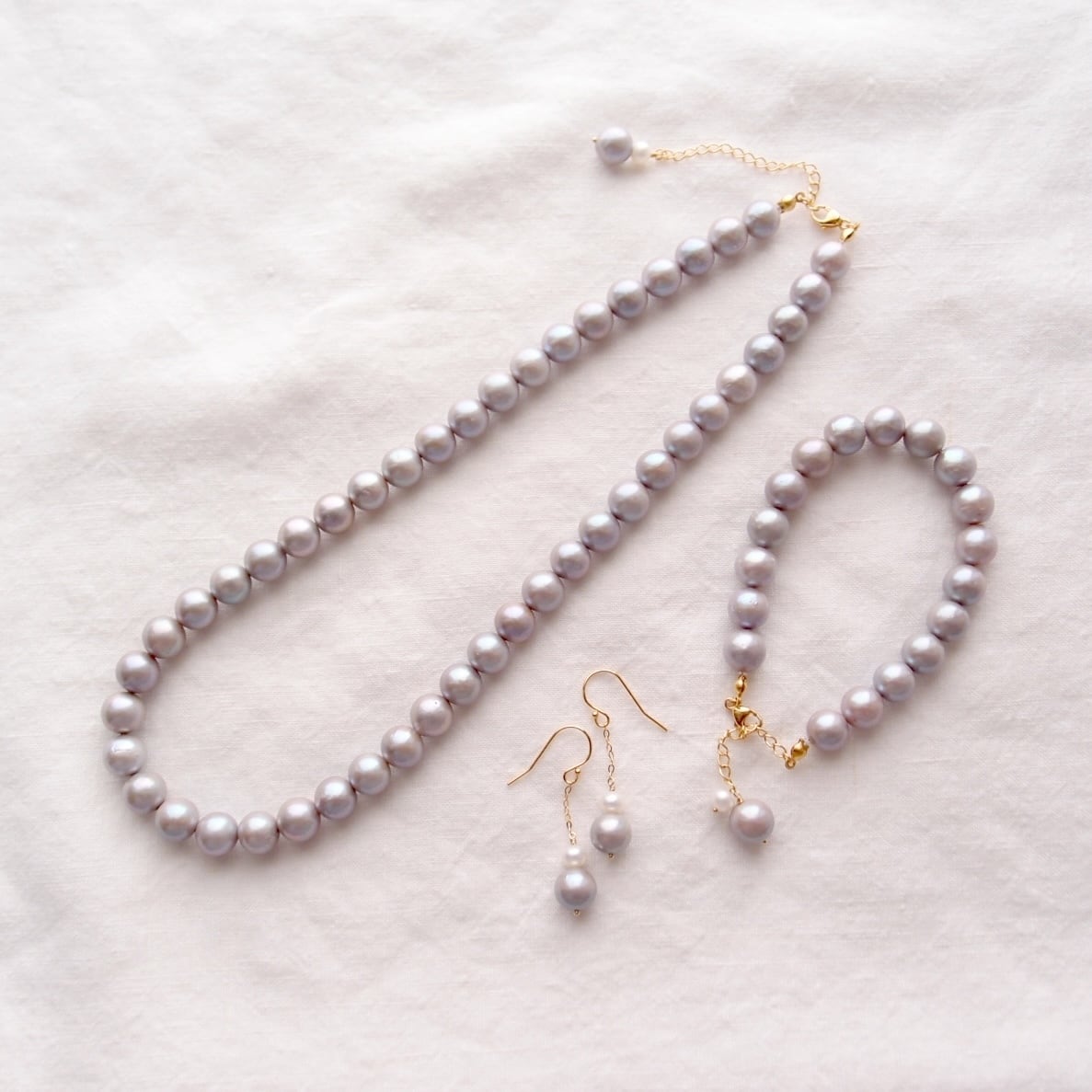 ふんわり上品なグレーカラーのラウンドパールをシンプルに並べた定番ネックレス。