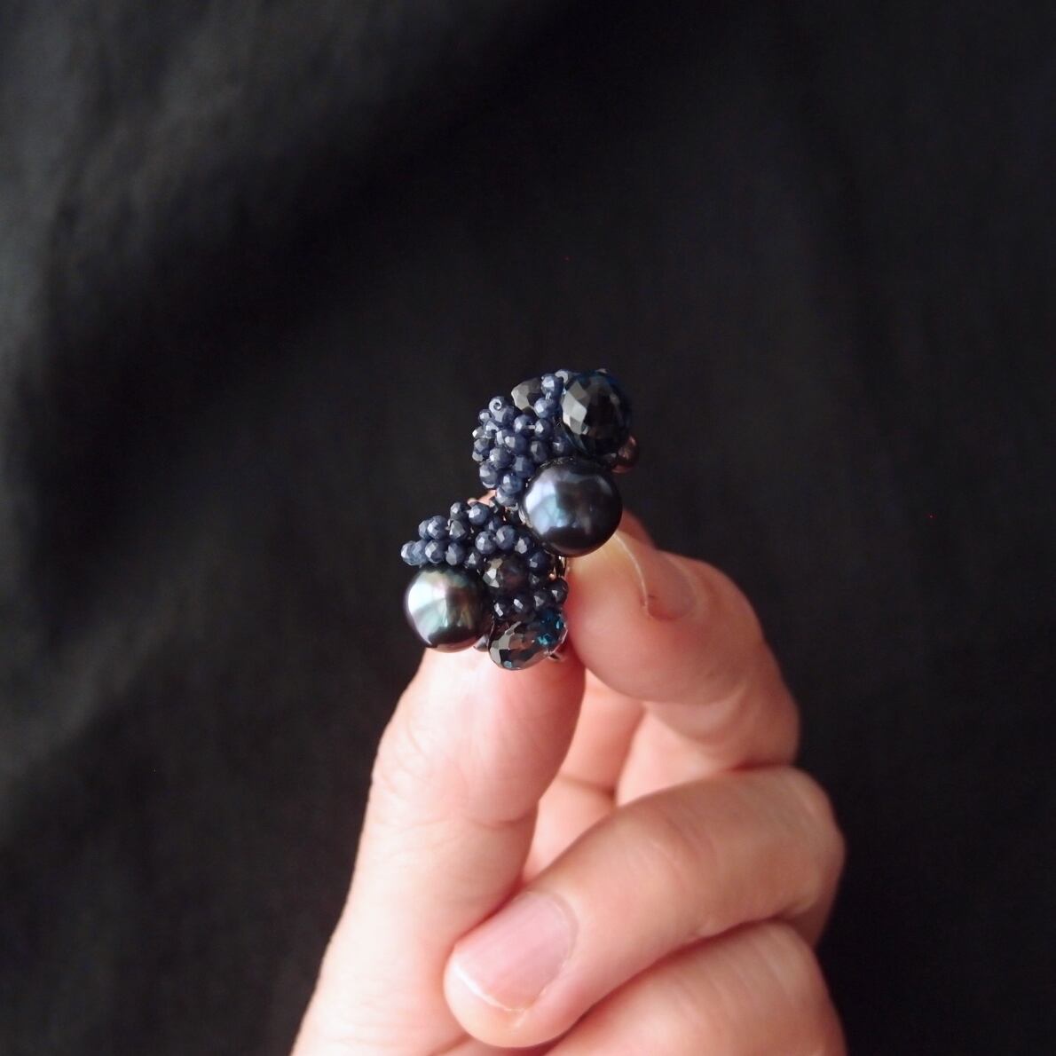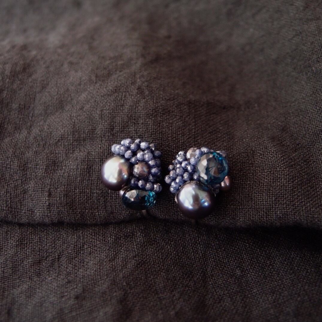 【天然石刺繍/イヤリング】london blue topaz × pearl × bluesapphire × iolite【asymmetry】