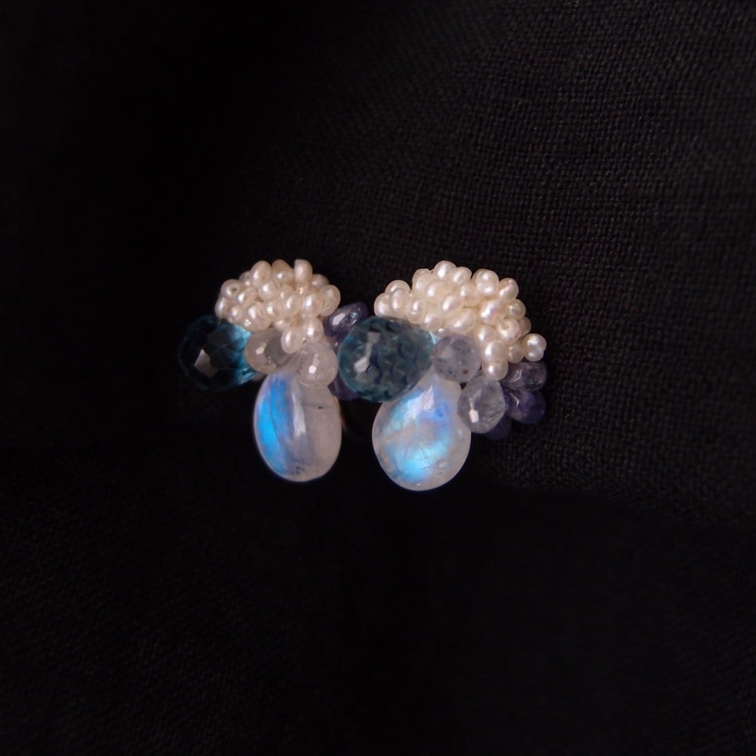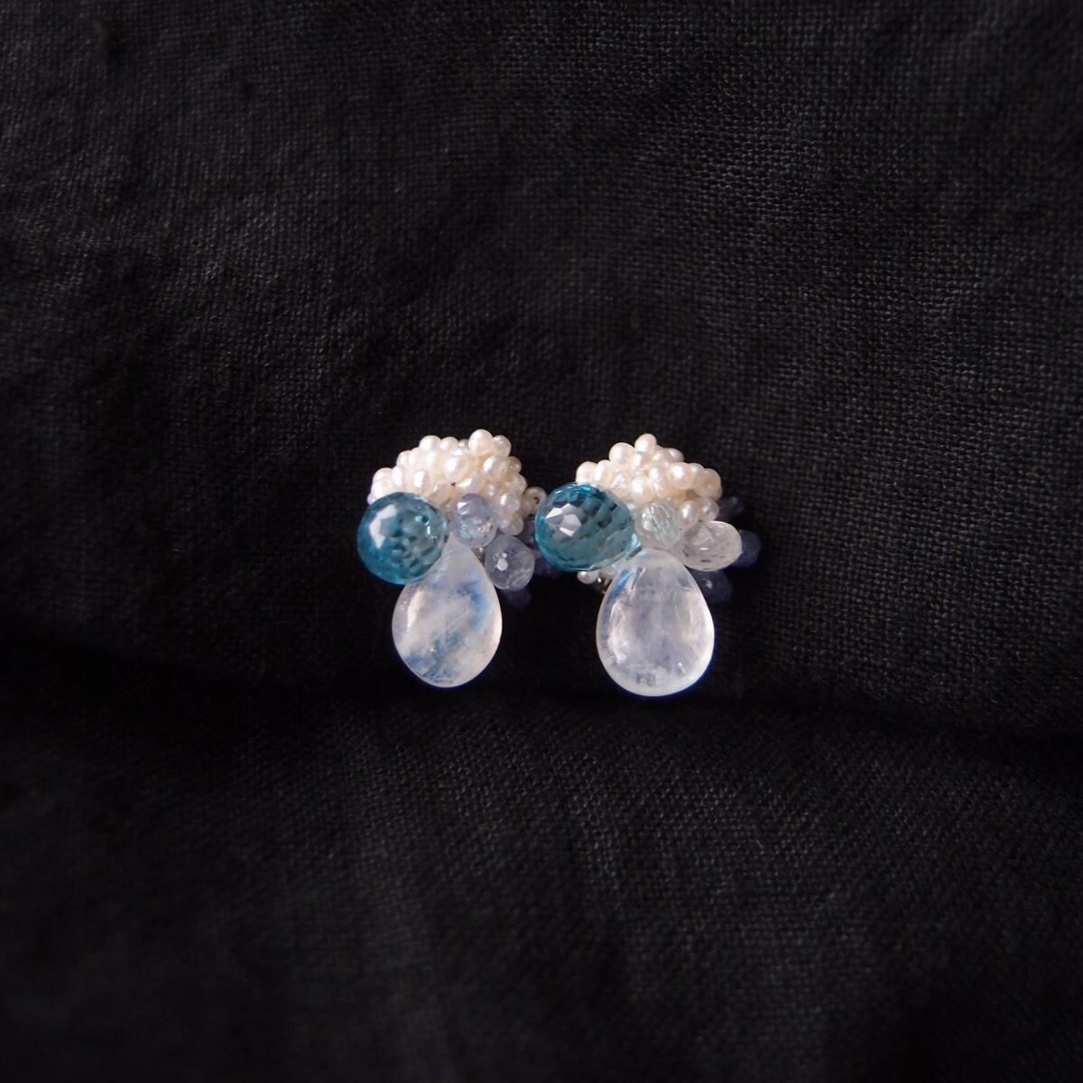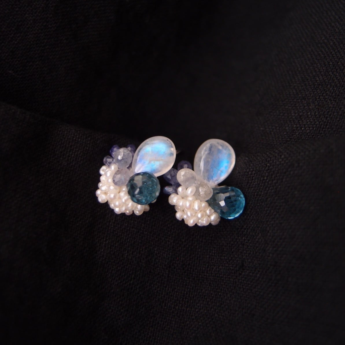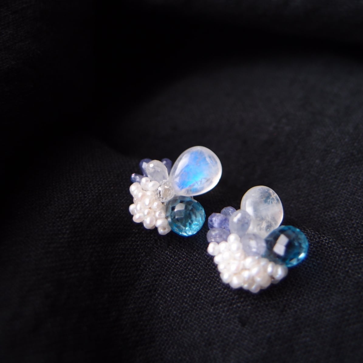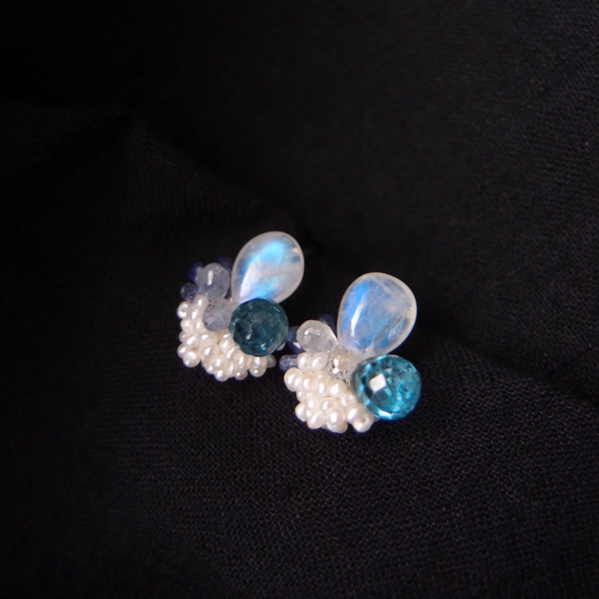 【天然石刺繍/イヤリング】blue sapphire × blue moonstone × london bluetopaz × pearl