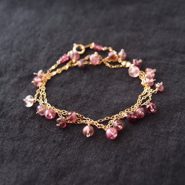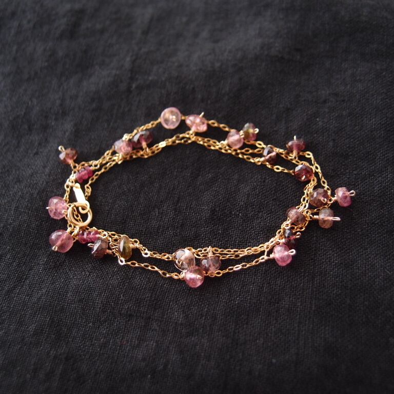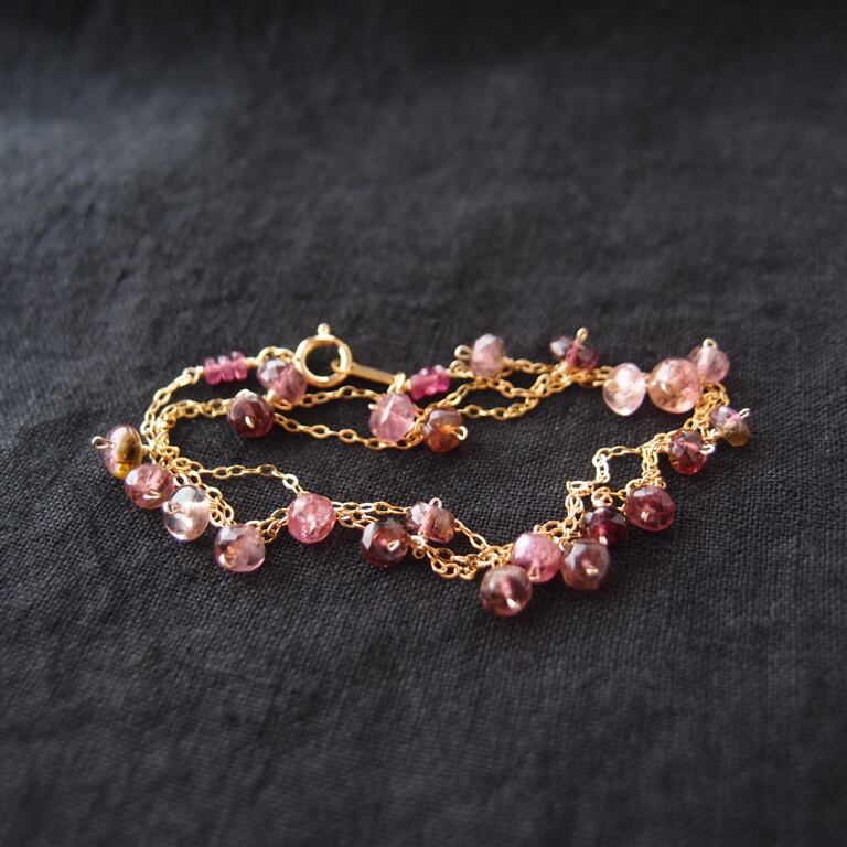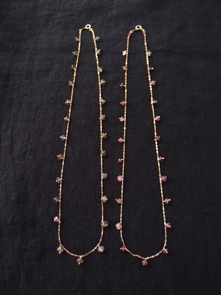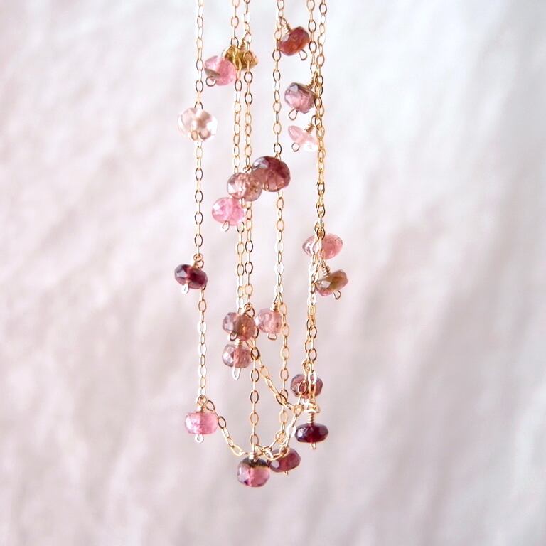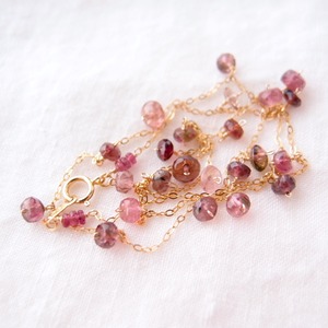ワイン系の濃色粒など大きめカットのピンクトルマリンを使用したネックレス。