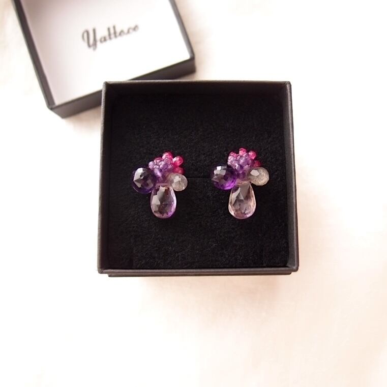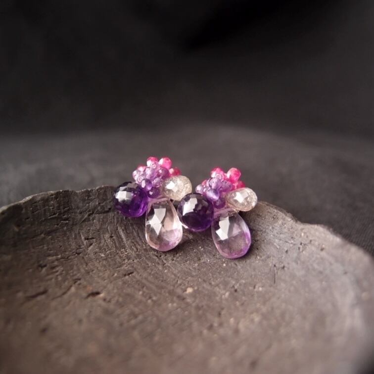 【天然石刺繍/ピアス 】Ametrine × Amethyst × Ruby Earrings/アメトリン×アメシスト×ルビー